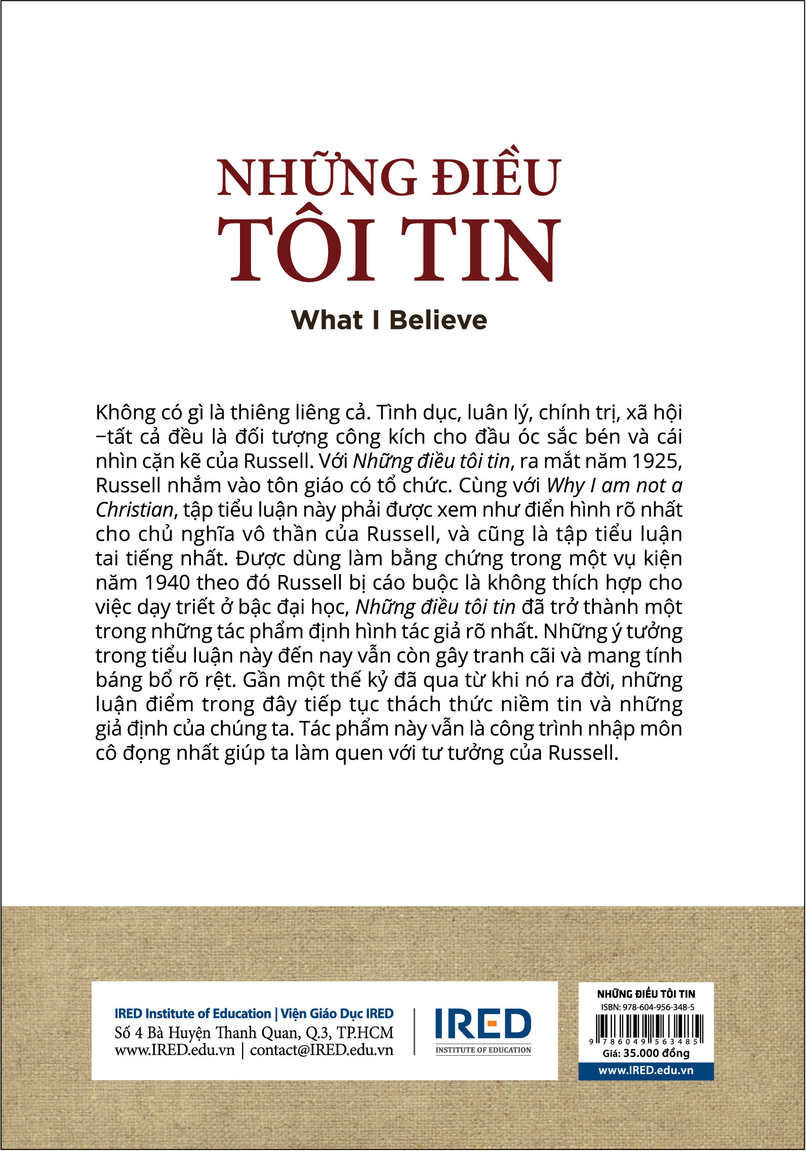 Betrand Russell (1872 - 1970) đã có nhiều đóng góp đối với triết học, đặc biệt là những tiểu luận triết học sắc bén về các đề tài nhạy cảm và còn gây tranh cãi cho đến tận hôm nay. Những điều tôi tin là một trong số đó. Qua quyển sách này, ông đã trình bày những điều ông nghĩ về vị thế con người trong vũ trụ và những con đường khả dĩ để thành tựu một cuộc đời thiện hảo.