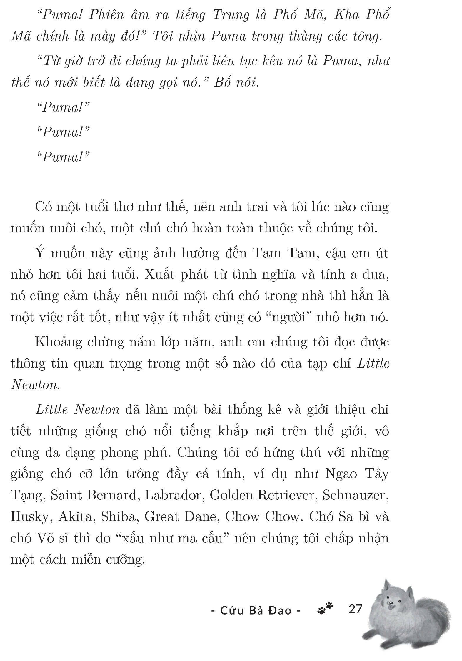 Ngoài những tình huống hài hước giữa anh hai và Puma, cuốn sách còn chứa đựng dòng hồi ức đầy tiếng cười, niềm hạnh phúc, niềm xót xa về mối tình 6 năm với nàng “tiểu Long Nữ” – người đã gắn bó với Cửu Bả Đao trong suốt quãng thời gian sinh viên nghèo khó. Hay hành trình chữa bệnh đầy khó khăn vất vả của mẹ Cửu Bả Đao nhưng tràn đầy tình cảm gia đình ấm áp….