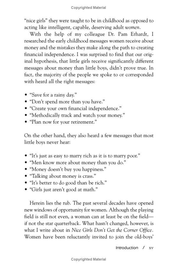 In NICE GIRLS DON'T GET RICH, Dr. Frankel offers women financial and investment advice for succeeding in life. Although women may not know it, certain behaviors and habits that they learned when they were girls
