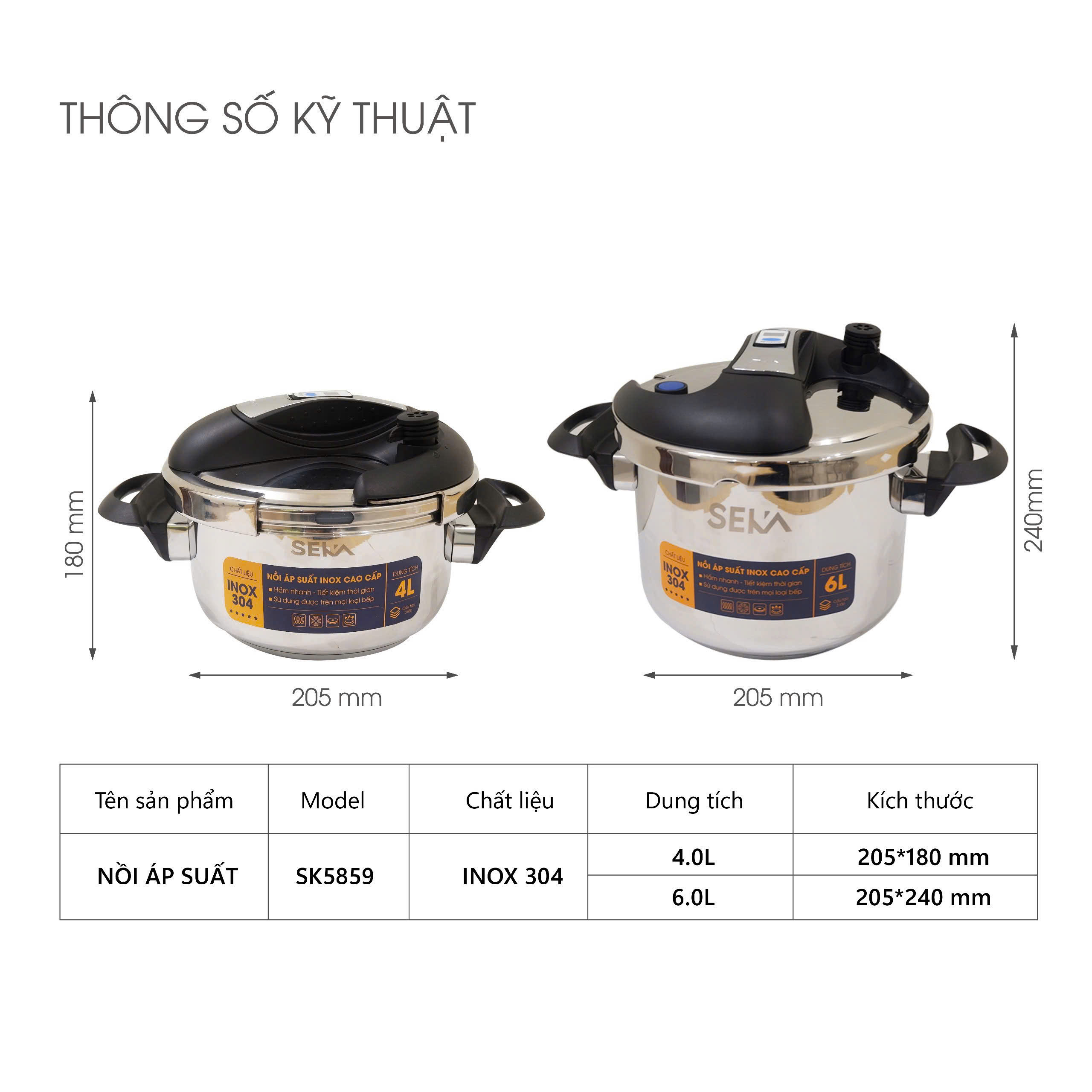 Nồi áp suất từ Seka SK5859 inox 304 dung tích 4L và 6L tặng kèm vung kính, Dùng được mọi loại bếp
