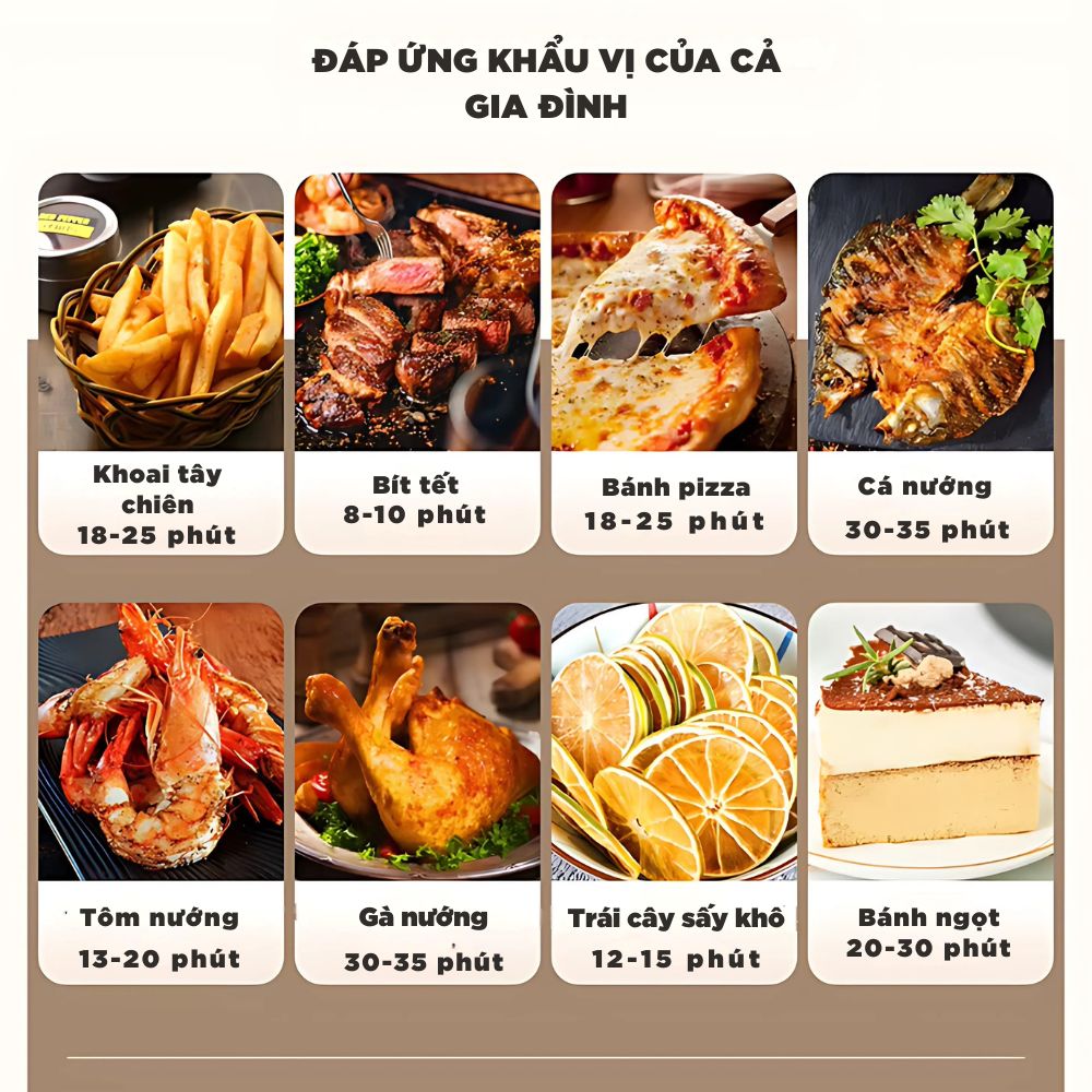 Ưu điểm nổi bật - Dung tích lớn 15 lít – thoải mái chiên nướng gà nguyên con, cá, sườn, bánh… phục vụ cả gia đình. - Công suất mạnh mẽ 1350W – làm chín