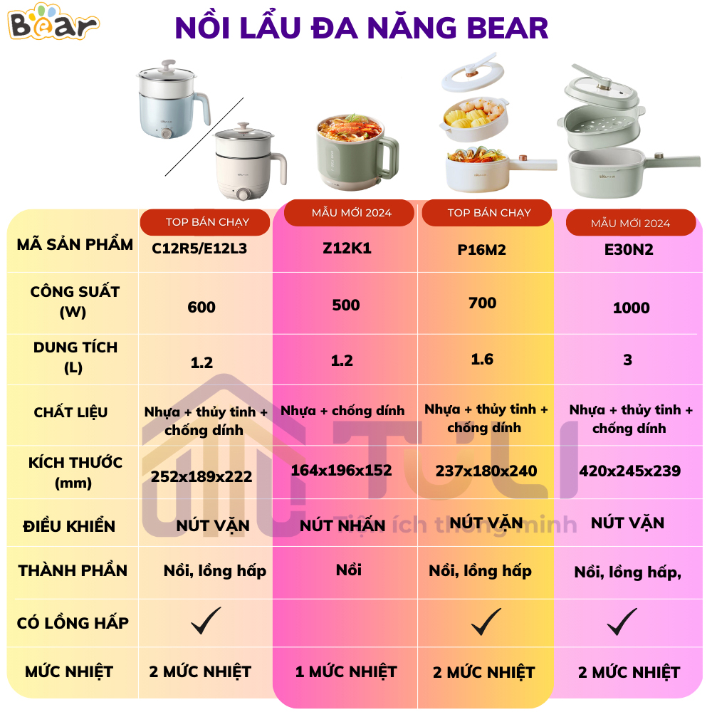 THÔNG TIN SẢN PHẨM: Thương hiệu: Bear Model: DRG-E15P2 Công suất: 400W (Thích hợp hấp, hầm), 800W (Thích hợp xào, nấu lẩu) Dung tích: 1.6Lít Lòng nồi: Phủ lớp tráng men Vỏ nồi: Kim loại