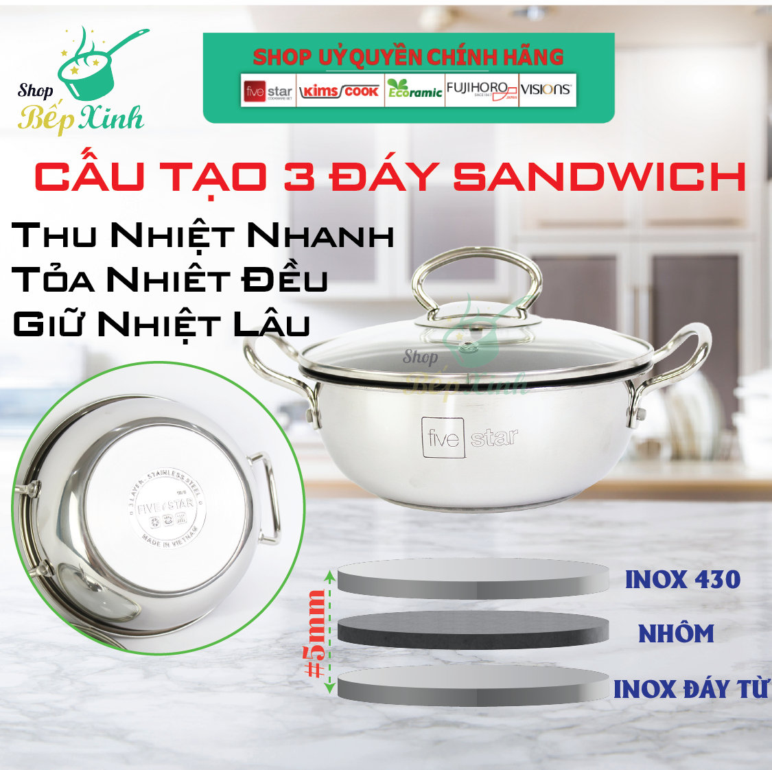Nồi Inox 304 chống dính 3 đáy Fivestar 20cm dùng bếp từ, chính hãng bảo hành 60 tháng #sanhangre