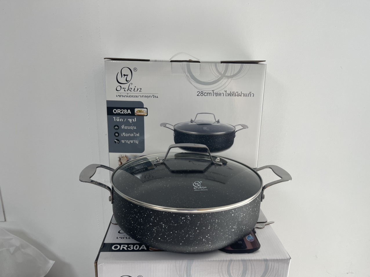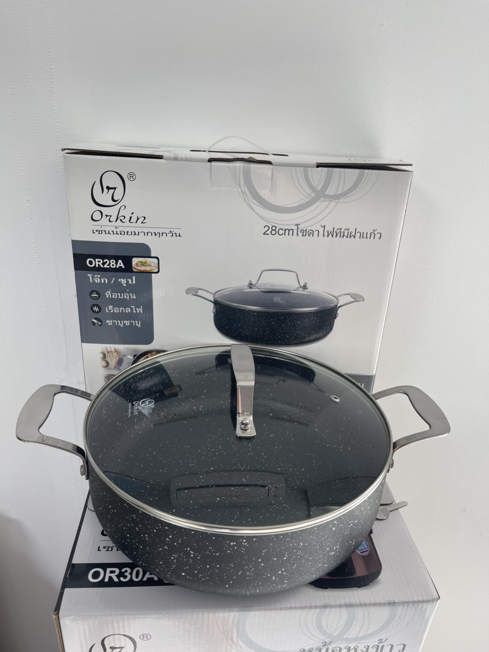 Nồi lẩu chống dính vân đá Orkin Thái Lan, vung kính đáy từ Tên sản phẩm: Chảo lẩu chống dính vân đá đáy từ Thương hiệu: Orkin Thái Lan Công nghệ sản xuất Thái Lan