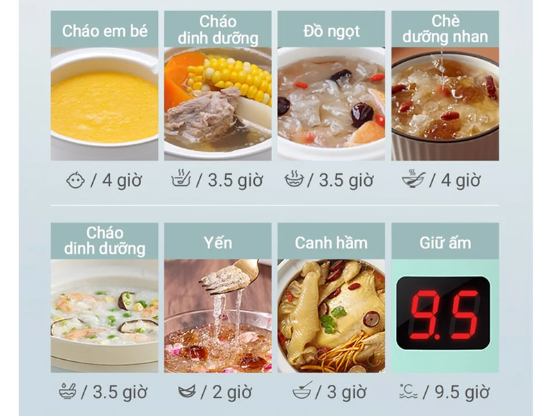 Công suất 200W Điện áp đầu vào 220V-240V/50Hz Dung tích 3,5 Lít Màu sắc màu trắng Đa chức năng : Kho cá, hầm xương, chưng yến, sắc thuốc bắc, nấu cháo ... Bảng điều