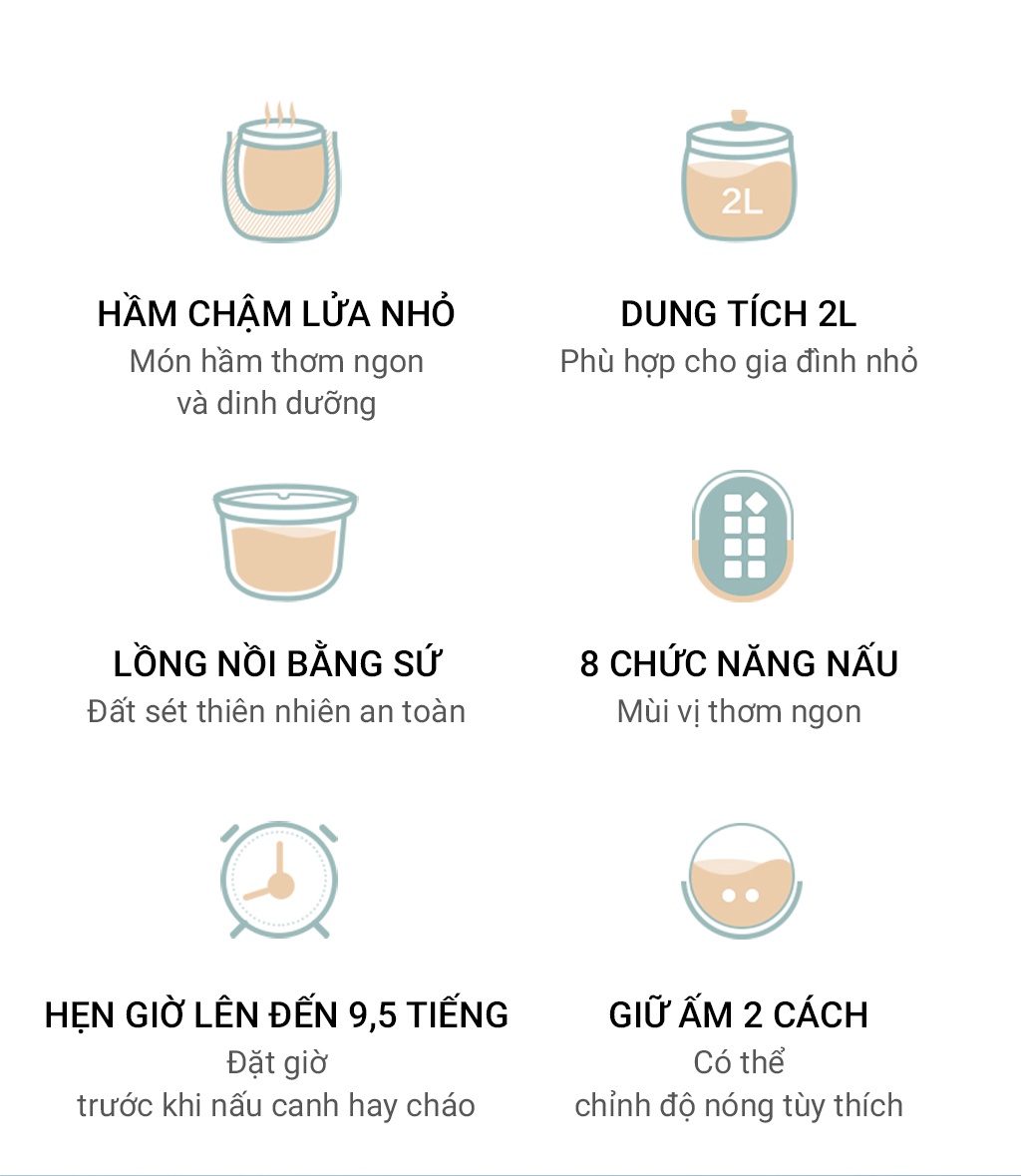 Chế độ hầm nhanh bằng nước nóng tiện lợi Nồi có khả năng dẫn nhiệt và giữ nhiệt tốt Hầm chậm với lửa nhỏ đảm bảo dưỡng chất Chất liệu nồi chắc chắn với khả