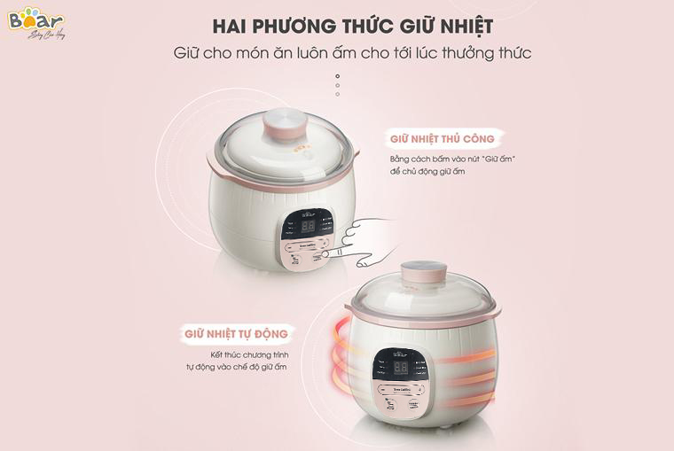 Sở hữu thiết kế thông minh nồi hầm đa năng Bear DDZ-B08C1 (SUBE001)cho phép người dùng làm nhiều món ăn khác nhau như: nấu cháo, làm món hầm,món hấp, ủ thức ăn, nấu canh, Đặc biệt, lõi nồi được làm bằng gốm cao cấp giúp giữ nhiệt lâu hơn, đảm bảo an toàn vệ sinh hơn các loại lõi nồi thông thường khác.
