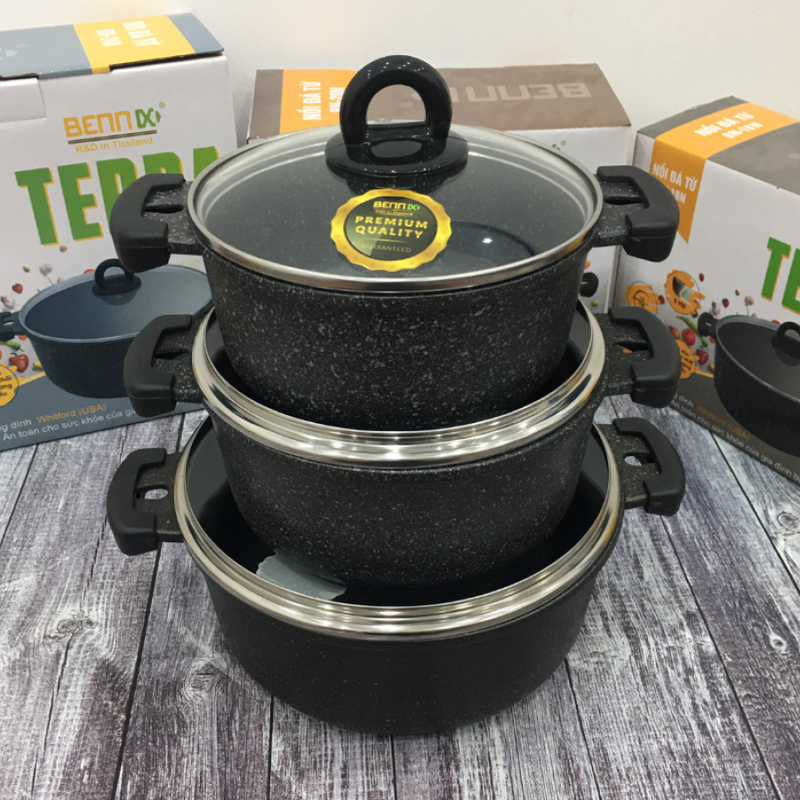 - Nồi bếp từ Bennix Terra men đá có 3 size với kích thước 18cm, 20cm và 24cm, đây là các kích cỡ thường được sử dụng nhiều nhất trong gia đình