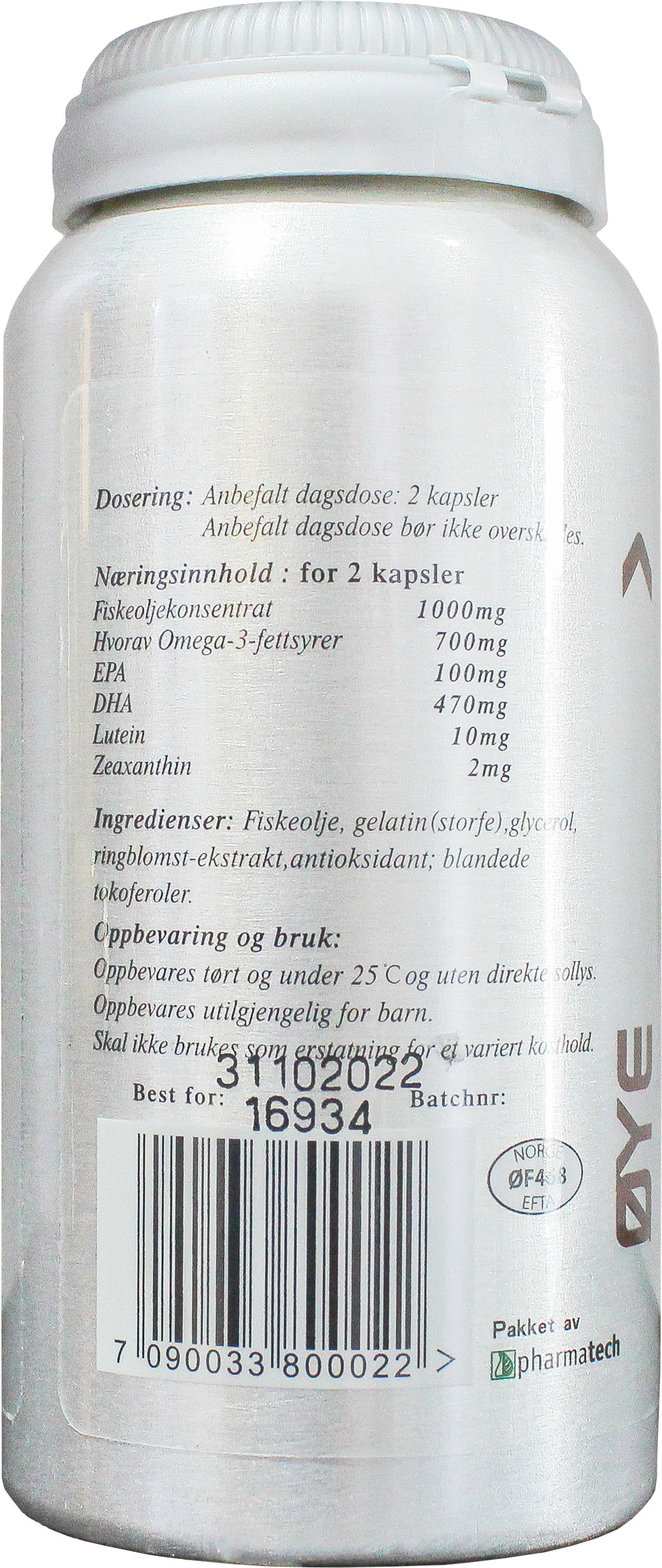 Omega 3 Norsk ØYE 30 Viên   THÀNH PHẦN: Thành phần có trong 2 kapsler NORSK ØYE Fiskeoljekonsentrat 1000mg Hvorav Omega-3-fettsyrer 700mg EPA 100mg DHA 470mg Lutein 10mg Zeaxanthin 2mg - Ingredienser:Fiskeolje,gelatin(storfe) - glycerol, antioksidant,blandede