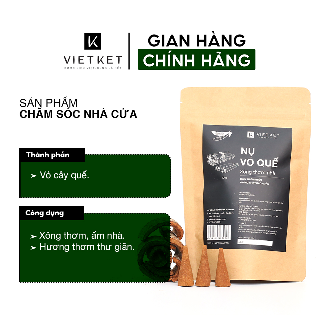 Nụ Vỏ Quế VIETKET (100g) - Xông nhà tẩy uế Thành phần: quế,vỏ bời lời Công dụng: Xông nhà tẩy uế có ý nghĩa xua đuổi những điều không may mang lại bình an, may