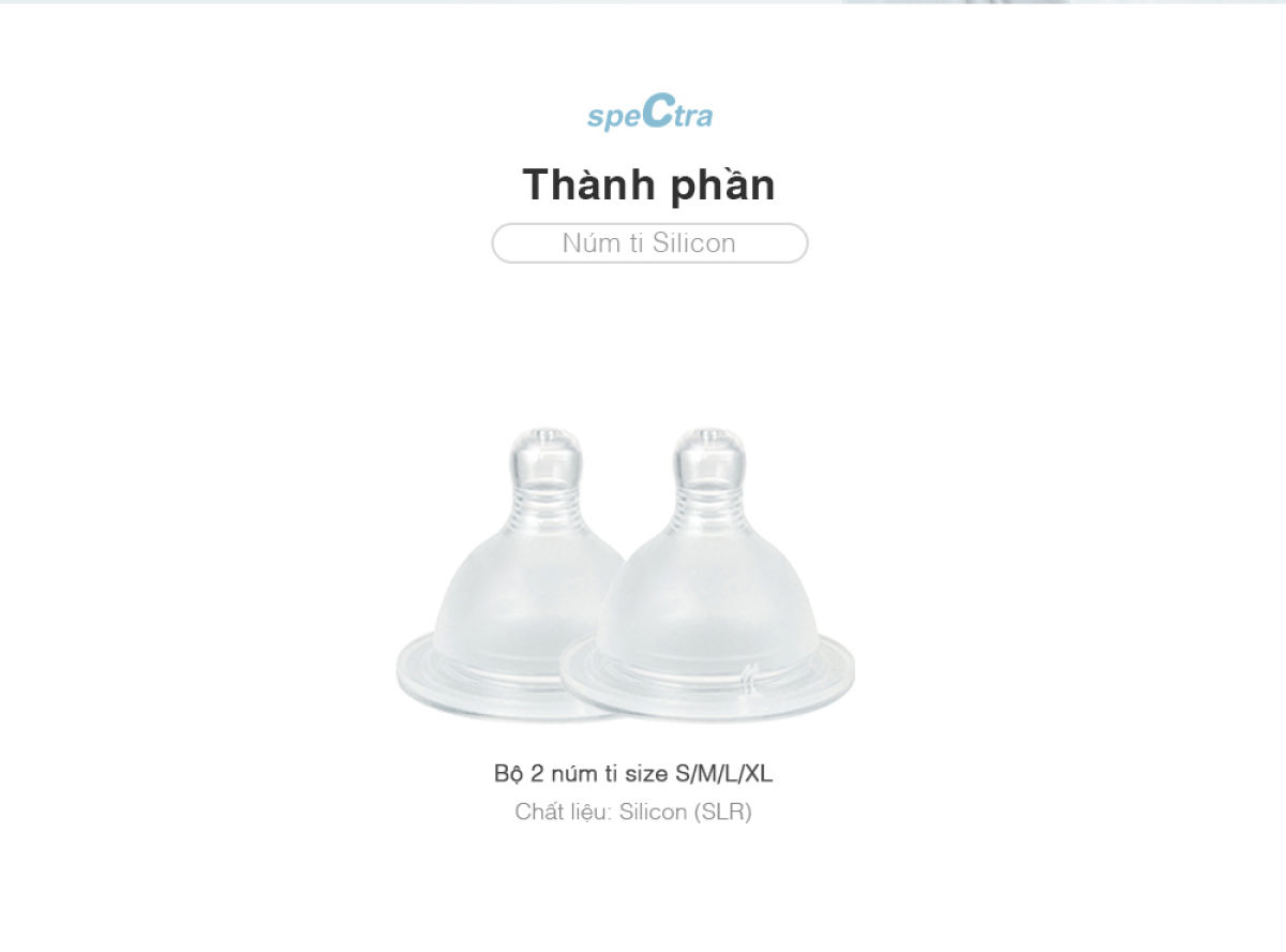 - Núm ti Spectra được làm bằng chất liệu cao su silicon mềm, có độ đàn hồi và co giãn tốt, không màu và không mùi, không làm ảnh hưởng tới chất lượng cũng như mùi vị sữa. Núm ti có van thông khí chống sặc giúp lưu thông khí, điều chỉnh dòng chảy, làm giảm nguy cơ đau bụng, đầy hơi, nôn và nấc ở trẻ.