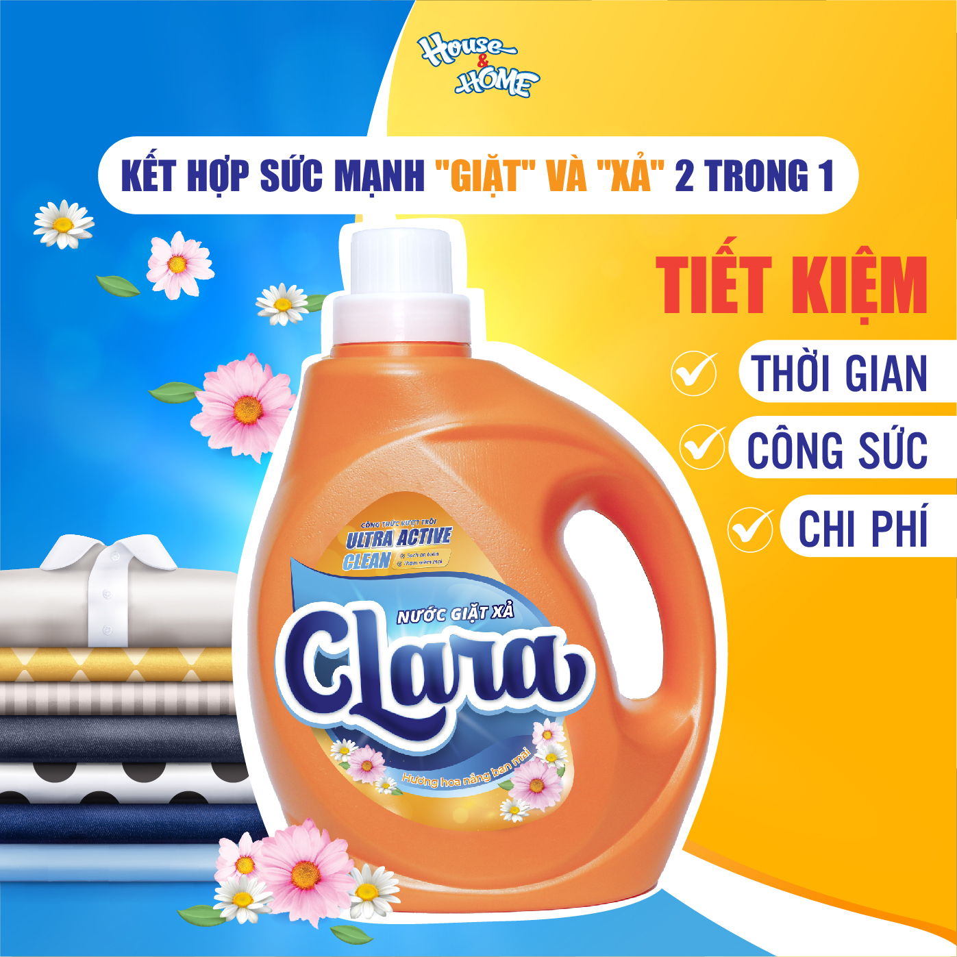 - Tên sản phẩm: Nước giặt xả Clara hương hoa nắng ban mai, 2.6Kg - Thông tin thương hiệu: Clara là nhãn hàng thuộc Công ty Cổ phần Sản xuất Gia dụng House & HOME,