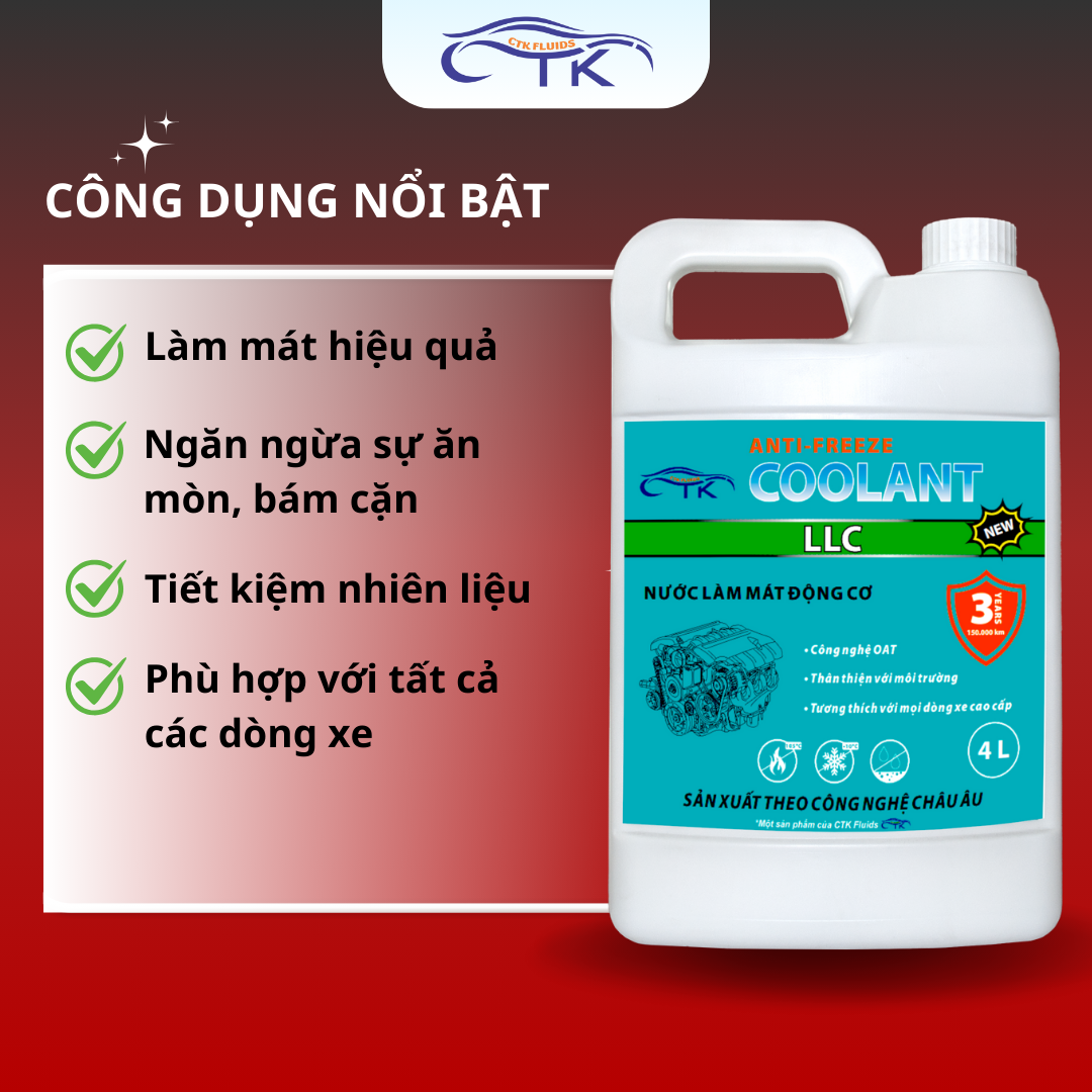 CTKF- CHUYÊN CUNG CẤP SẢN PHẨM CHO CÁC HÃNG XE LỚN VINFAST, HYUNDAI, FORD, ISUZU   NƯỚC LÀM MÁT ĐỘNG CƠ Ô TÔ MÀU XANH CTK Nước Làm Mát Động Cơ Ô Tô CTK Là Một Sản Phẩm Của CTK FLUILDS, Đảm Bảo Chính Hãng, Uy Tín, Chất Lượng  Thông Số Kỹ Thuật: - Loại: Nước làm mát động cơ ô tô màu xanh CTK LLC Coolant - Dung tích: 1 lít hoặc 4 lít - Thành phần: Ethylene Glycol 20%, Nước Dl, Chất phụ gia ức chế ăn mòn - Công nghệ phụ gia: OAT - Vòng đời: 150.000 Km/ 3 năm - Dòng xe tương thích: Tất cả các dòng xe: Ford, HyunDai, Isuzu, Vinfast - Điểm đóng băng, Điểm sôi: -8 độ C-> -10 độ C/ 103 độ C-> 105 độ C - Dòng xe tương thích: Tất cả dòng xe: Ford, HyunDai, Isuzu, Vinfast,... - Khuyến Nghị các khu vực nhiệt đới (Đông Nam Á, Trung Mỹ, Trung Phi) THÔNG SỐ KĨ THUẬT ĐẶC ĐIỂM NỔI BẬT - Chất lượng vượt trội: Công thức độc quyền giúp làm mát hiệu quả, ổn định nhiệt độ