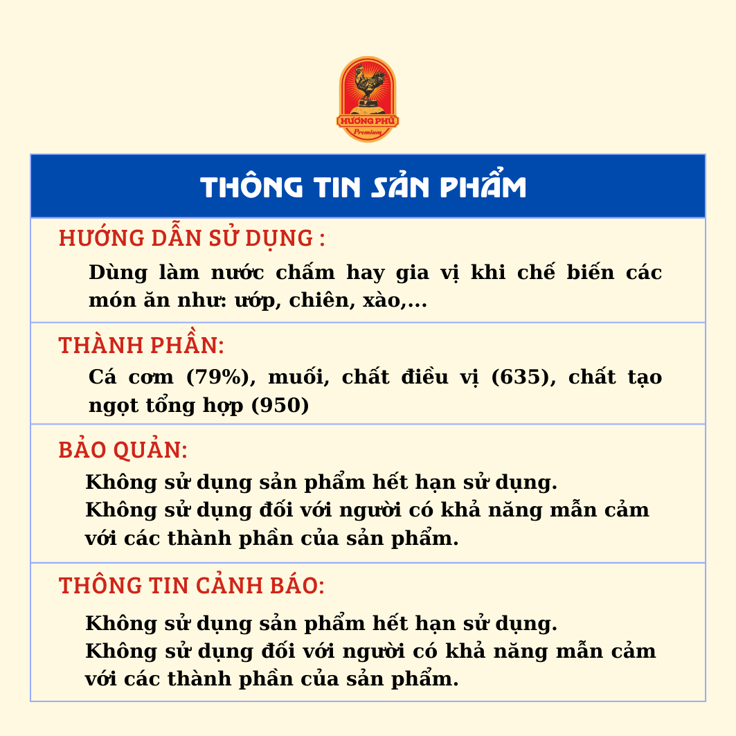 Nước mắm cá cơm Hương Phú dùng chấm trực tiếp hoặc làm gia vị chế biến thực phẩm. Ngon hơn khi bổ sung đường, chanh, ớt, tỏi trong mỗi lần dùng.