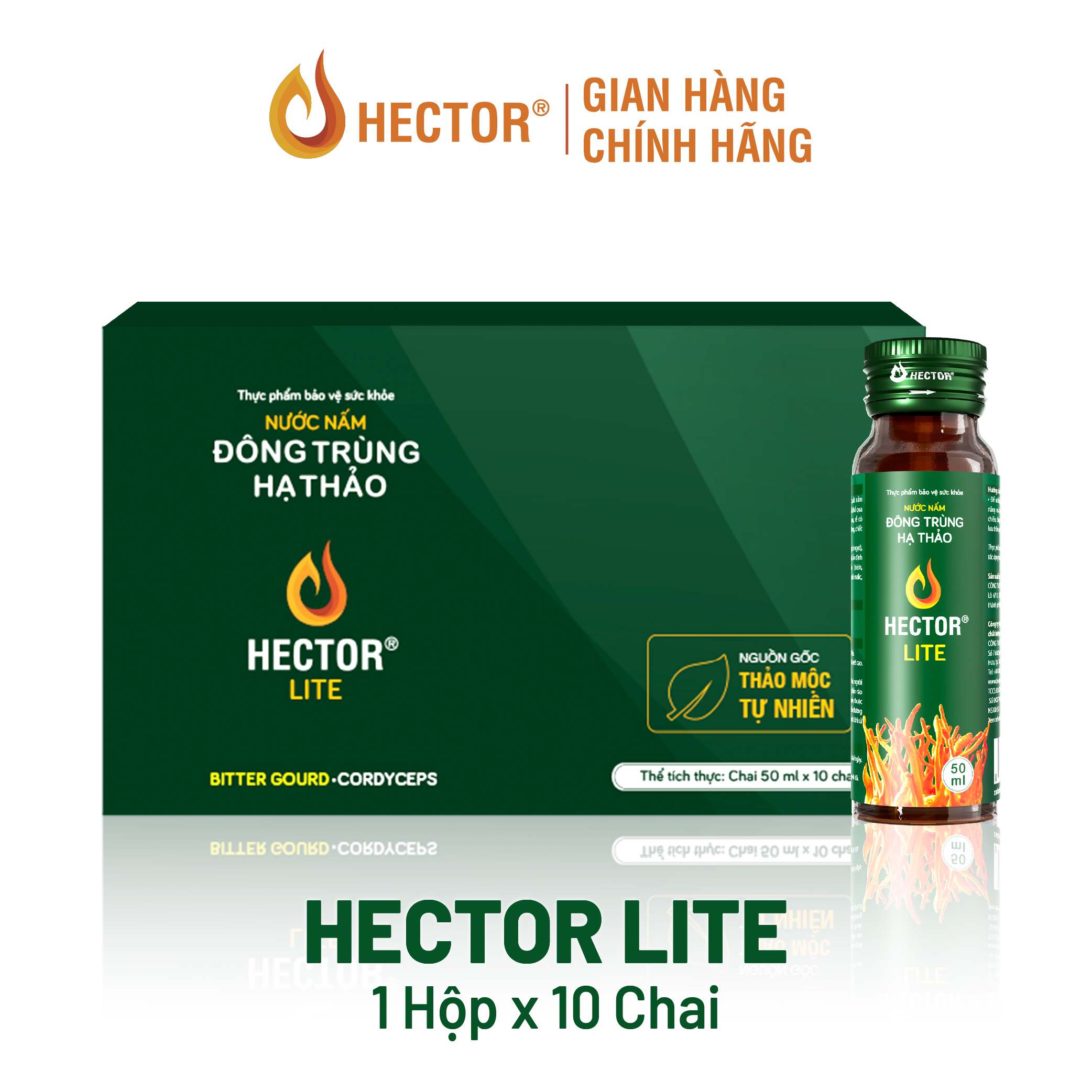 Trong mỗi chai nước nấm Đông trùng hạ thảo Hector Lite 50ml chứa: chiết xuất Đinh lăng 900mg, chiết xuất nấm Đông trùng hạ thảo 500mg, chiết xuất Khổ qua 300mg, chiết xuất Chùm ngây 300mg, rễ Cỏ tranh 150mg, chiết xuất Đẳng sâm 150mg, chiết xuất Hoa Actiso 150mg.