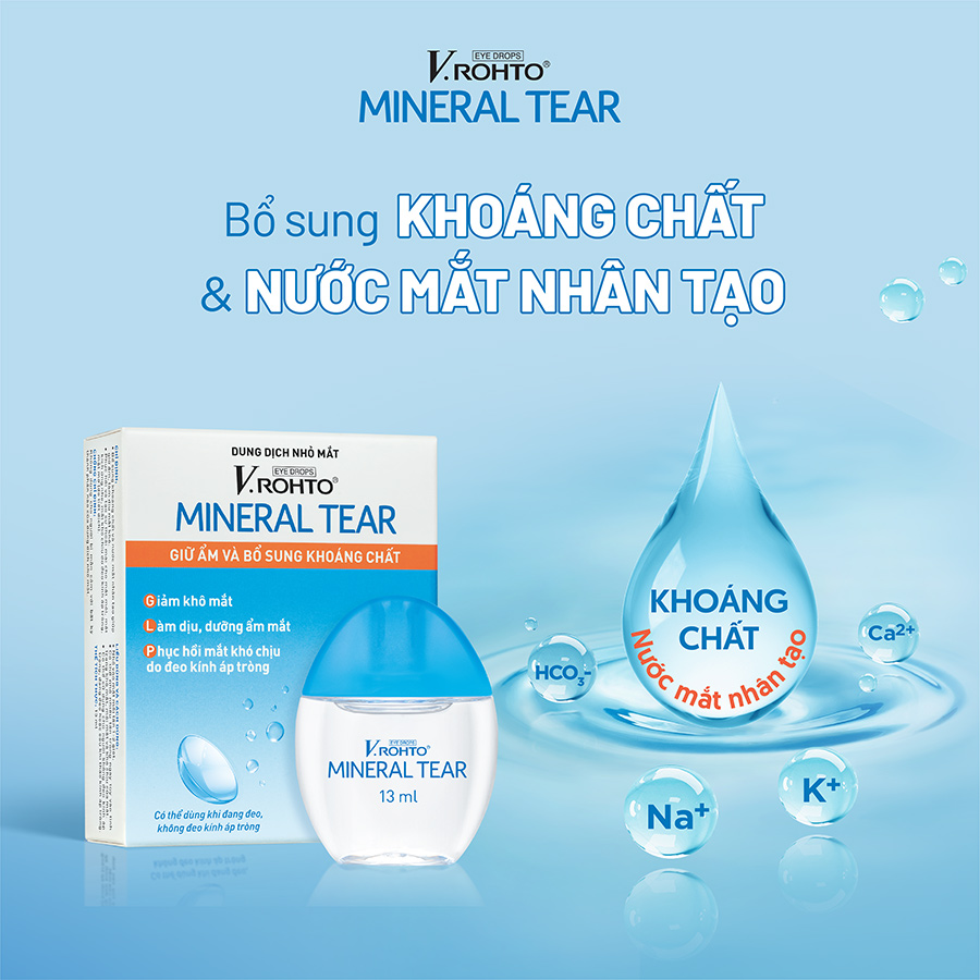 Mua tại TiktokDung dịch nhỏ mắt giữ ẩm & bổ sung khoáng chất V.Rohto Mineral Tear 13ml Nước nhỏ mắt giữ ẩm & bổ sung khoáng chất V.Rohto Mineral Tear chứa 4 thành phần khoáng chất: Na+, K+, Ca2+, HCO3- nhằm cung cấp các nguyên tố tương tự như nước mắt tự nhiên, giúp tái tạo lại nước mắt, giữ ẩm và làm dịu mắt khô. Ngoài ra, đối với những người thường xuyên đeo kính áp tròng, V.Rohto Mineral Tear giúp tạo một lớp màng dưỡng ẩm bảo vệ giữa kính áp tròng và mắt, giúp việc đeo kính áp tròng thoải mái hơn, ngay cả sau khi tháo kính áp tròng. Thành phần & công dụng: Nuôi dưỡng và bảo vệ mắt mỗi ngày với Nước nhỏ mắt V.Rohto Mineral Tear: