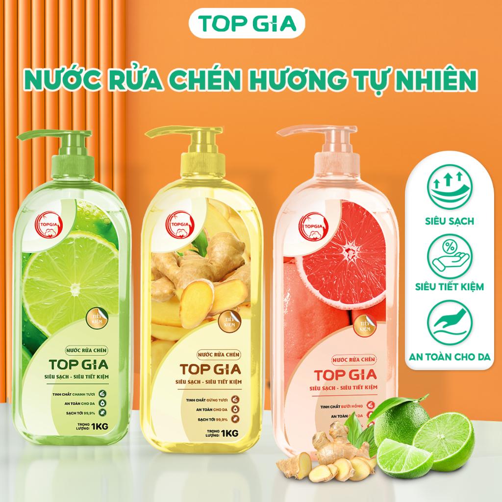 Nước Rửa Chén Bát TopGia 3 Mùi hương dung tích 1kg, không kích ứng da, an toàn bảo vệ da tay