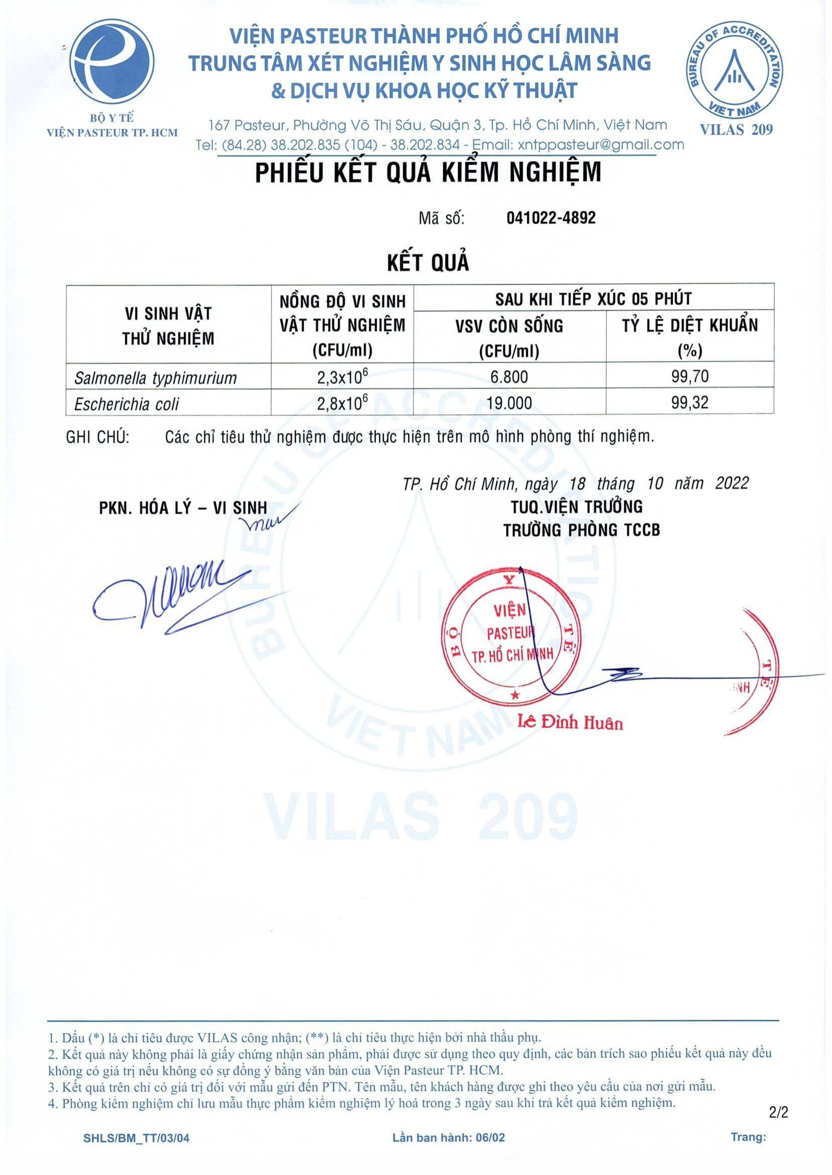 - Diệt 99% vi khuẩn đã được Viện Pasteur chứng nhận.