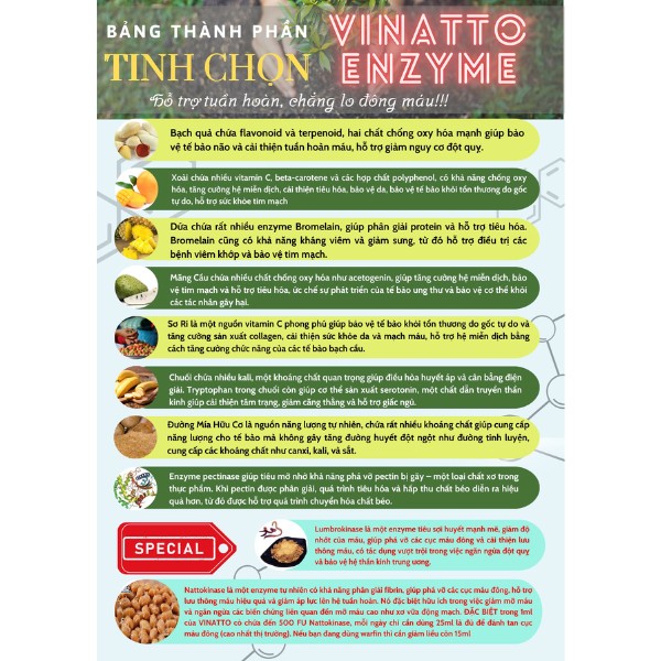- Nước uống Vinatto Enzyme Là sản phẩm bảo vệ sức khỏe toàn diện, đặc biệt trong hỗ trợ tim mạch và phòng ngừa đột quỵ, tai biến mạch máu não. Với công thức enzyme tự nhiên tiên tiến, sản phẩm giúp tăng cường tiêu hóa, cải thiện chuyển hóa dinh dưỡng và giảm nguy cơ mắc các bệnh lý nghiêm trọng.