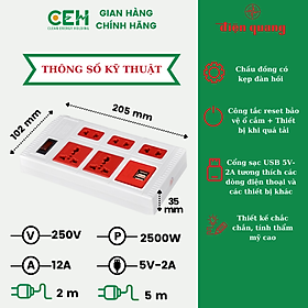 Dải điện áp hoạt động: (150-250)V/50Hz Dòng điện ổ cắm tối đa: 10A Công suất ổ cắm tối đa: 2500W Điện áp danh định sạc USB: 5V Dải nhiệt độ hoạt động: (-10-45)°C Kích thước