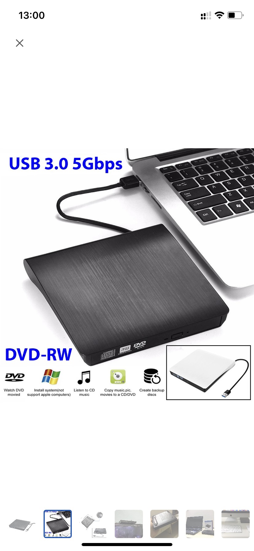 Tương thích với CD-R/RW, DVD ± R, DVD ± RW, DVD ± R DL, và DVD-RAM Giao diện USB 3.0 cho tốc độ truyền dữ liệu cao 8x DVD ± R đọc/ ghi, 24x CD-R/RW đọc/ ghi Nhỏ gọn và dễ dàng mang theo Dễ dàng Plug and play Yêu cầu: Máy tính để bàn hoặc máy tính laptop sử dụng cổng USB