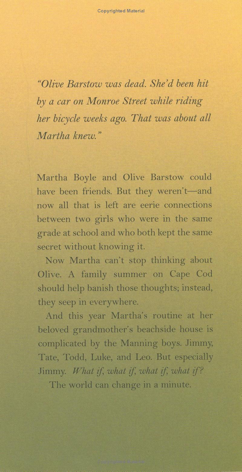 Sometimes life can change in an instant Martha Boyle and Olive Barstow could have been friends, but they weren't. Weeks after a tragic accident, all that is left are eerie connections between the two girls, former classmates who both kept the same secret without knowing it. Now, even while on vacation at the ocean, Martha can't stop thinking about Olive. Things only get more complicated when Martha begins to like Jimmy Manning, a neighbor boy she used to despise. What is going on? Can life for Martha be the same ever again?