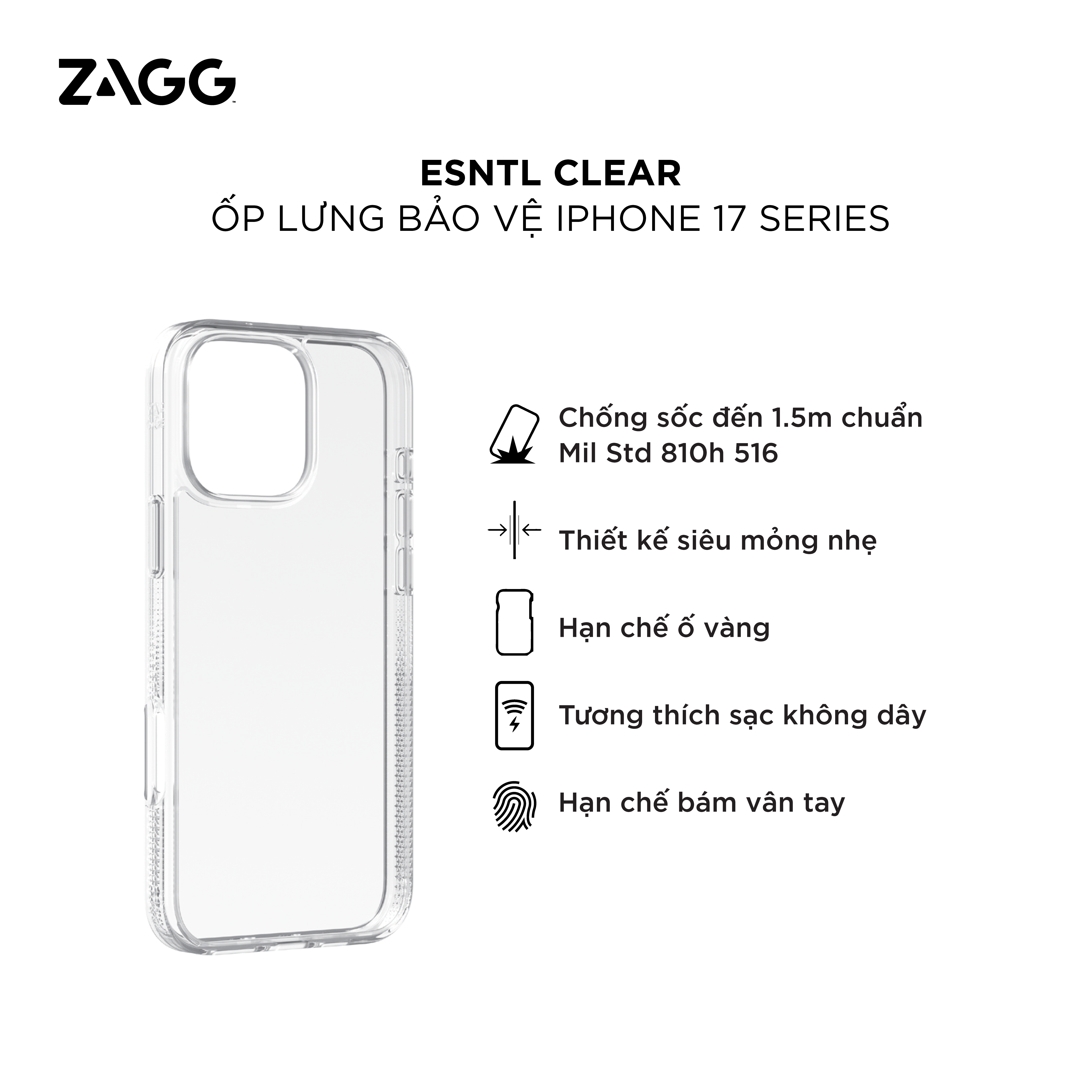 Ốp lưng ZAGG ESNTL Clear thiết kế dành cho iPhone 17 series với 4 kích thước khác nhau phù hợp cho từng dòng điện thoại: iPhone 17, iPhone 17 Air, iPhone 17 Pro và iPhone 17 Pro Max giúp ốp vừa vặn vào điện thoại của bạn, hạn chế tối đa trầy xước, hư hỏng không đáng có.