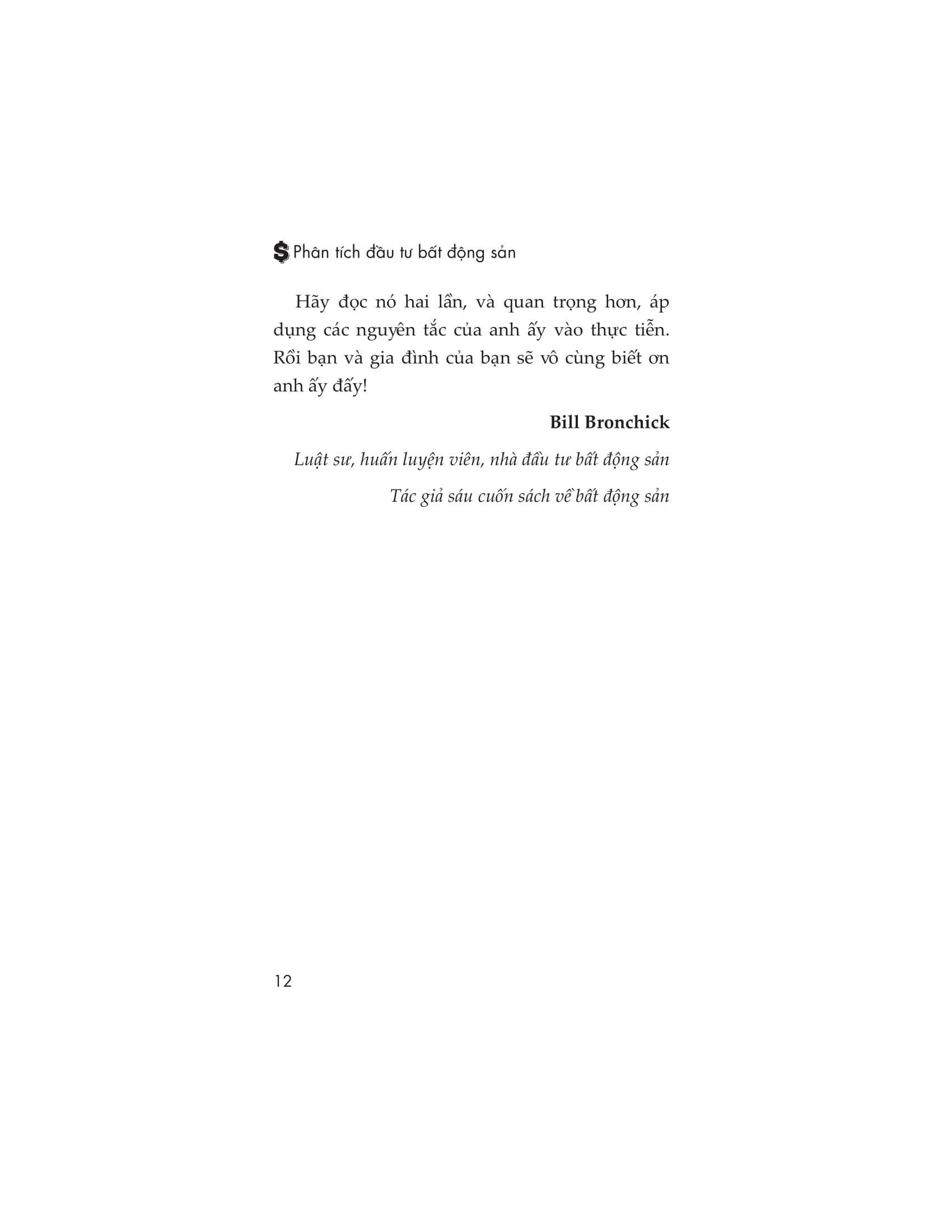 Bạn có thể là người mới bắt đầu làm giàu và đã chọn cuốn sách này vì đang tìm cách tăng thu vài nhập hoặc tích lũy của cải. Bạn có thể cảm thấy mệt mỏi trước những thăng trầm của thị trường chứng khoán và tìm kiếm lợi tức ổn định hơn từ nguồn tiền của mình. Tuy nhiên, nhiều khả năng bạn chọn cuốn sách này vì bạn muốn được tự do về tài chính. Dù lý do của bạn là gì, “Phân tích đầu tư bất động sản” cũng sẽ giúp bạn đặt những bước chân đầu tiên và xa hơn nữa trên hành trình làm giàu và thành công lâu dài về mặt tài chính.