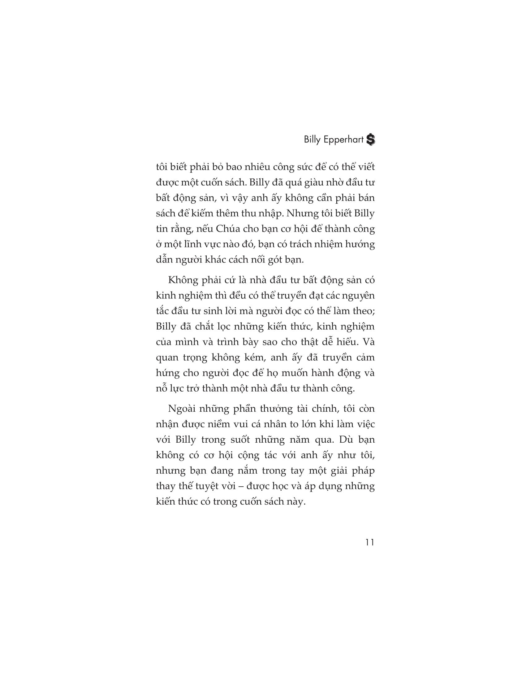 Tuy nhiên, bạn có thể rút ngắn đáng kể hành trình dài đằng đẵng ấy bằng cách tận dụng kinh nghiệm của những người khác. Nhưng nếu làm vậy, hãy đảm bảo rằng bạn tận dụng được kinh nghiệm của một chuyên gia. Và không thể phủ nhận, Billy Epperhart là một người như vậy. Không phải cứ là nhà đầu tư bất động sản có kinh nghiệm thì đều có thể truyền đạt các nguyên tắc đầu tư sinh lời mà người đọc có thể làm theo; Billy đã chắt lọc những kiến thức và kinh nghiệm của mình và trình bày sao cho thật dễ hiểu. Và quan trọng không kém, anh ấy đã truyền cảm hứng cho người đọc để họ muốn hành động và nỗ lực trở thành một nhà đầu tư thành công.