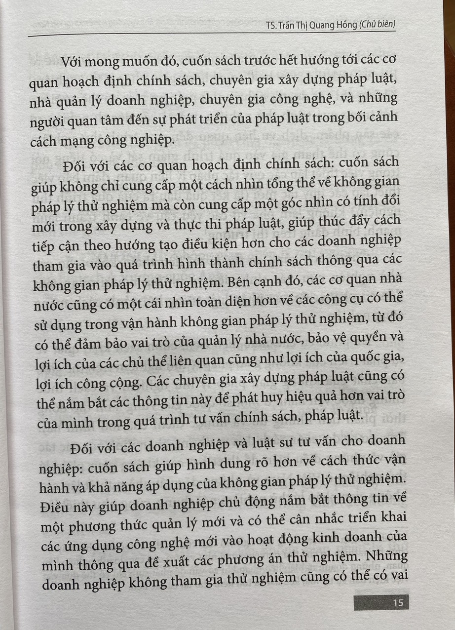 Từ những quan sát đó, nhóm làm việc của Viện Khoa học pháp lý và các chuyên gia từng cộng tác đã cùng nhau biên soạn cuốn sách: Phát triển không gian pháp lý thử nghiệm (Regulatory Sandbox) cho FinTech và các lĩnh vực công nghệ mới tại Việt Nam. Mục đích trước hết của cuốn sách này là cung cấp một nguồn tư liệu đáng tin cậy cho những người quản lý, các chuyên gia và công chúng về sự hình thành, phát triển, đặc điểm của các không gian pháp lý thử nghiệm, khả năng và những gợi ý cho việc thiết lập các không gian pháp lý thử nghiệm trong điều kiện ở Việt Nam. Mục đích này xuất phát từ mong muốn của chúng tôi là góp phần nhỏ bé của mình vào quá trình xây dựng, hoàn thiện pháp luật trong bối cảnh CMCN 4.0. Nhờ đó, Việt Nam có thể tận dụng được những sáng kiến về quản trị nhà nước đã được hình thành từ quá trình phát triển ở nhiều quốc gia trên thế giới như một cách để tận dụng được những thành tựu mới của cuộc cách mạng công nghệ.