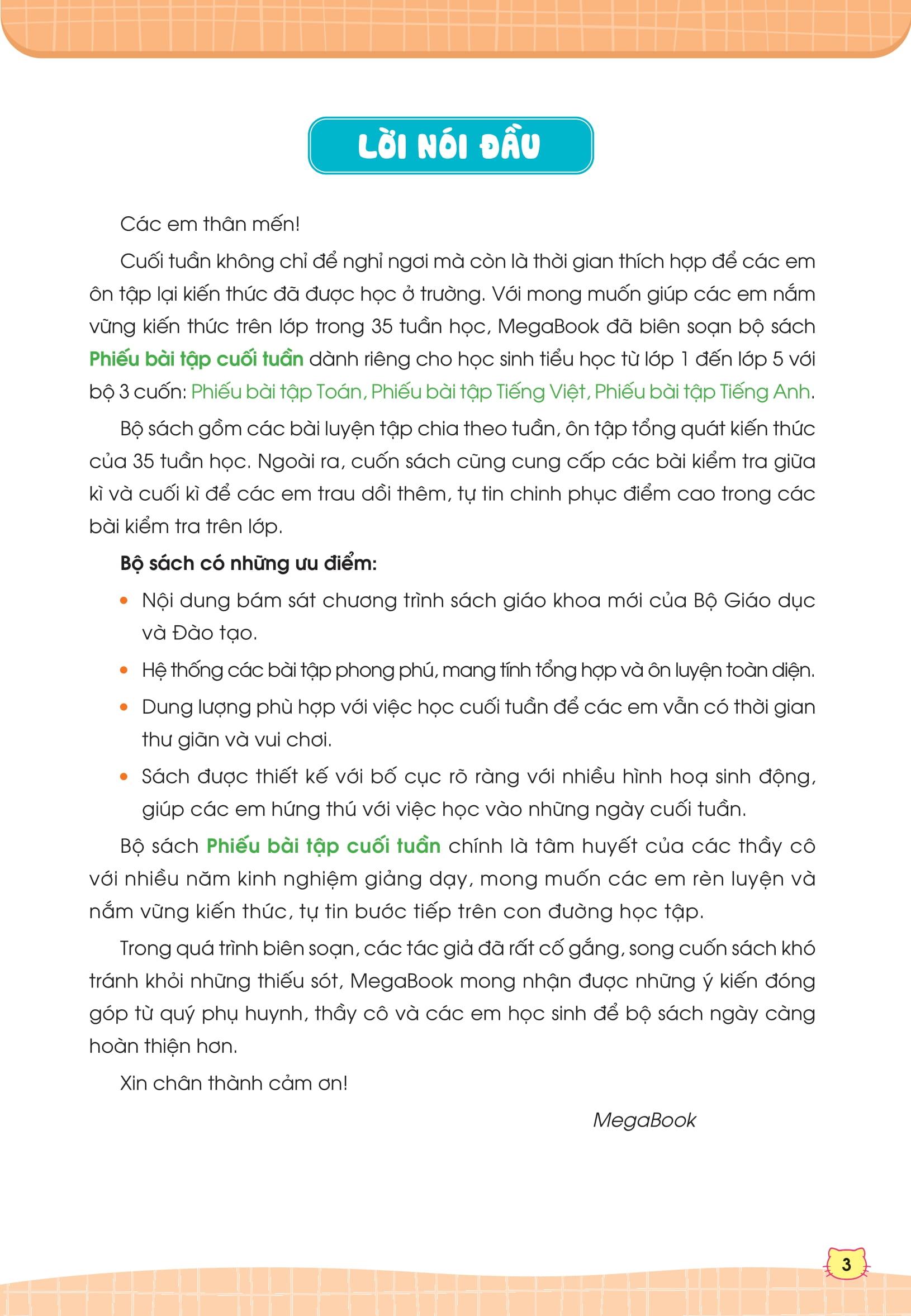 Cuối tuần không chỉ để nghỉ ngơi mà còn là thời gian thích hợp để các con ôn tập lại kiến thức đã được học ở trường. Với mong muốn giúp các con nắm vững kiến thức trên lớp trong 35 tuần học, chúng tôi đã biên soạn bộ sách Phiếu bài tập cuối tuần dành riêng cho học sinh tiểu học từ lớp 1 đến lớp 5 với bộ 3 cuốn: Phiếu bài tập Toán, Phiếu bài tập Tiếng Việt, Phiếu bài tập Tiếng Anh.