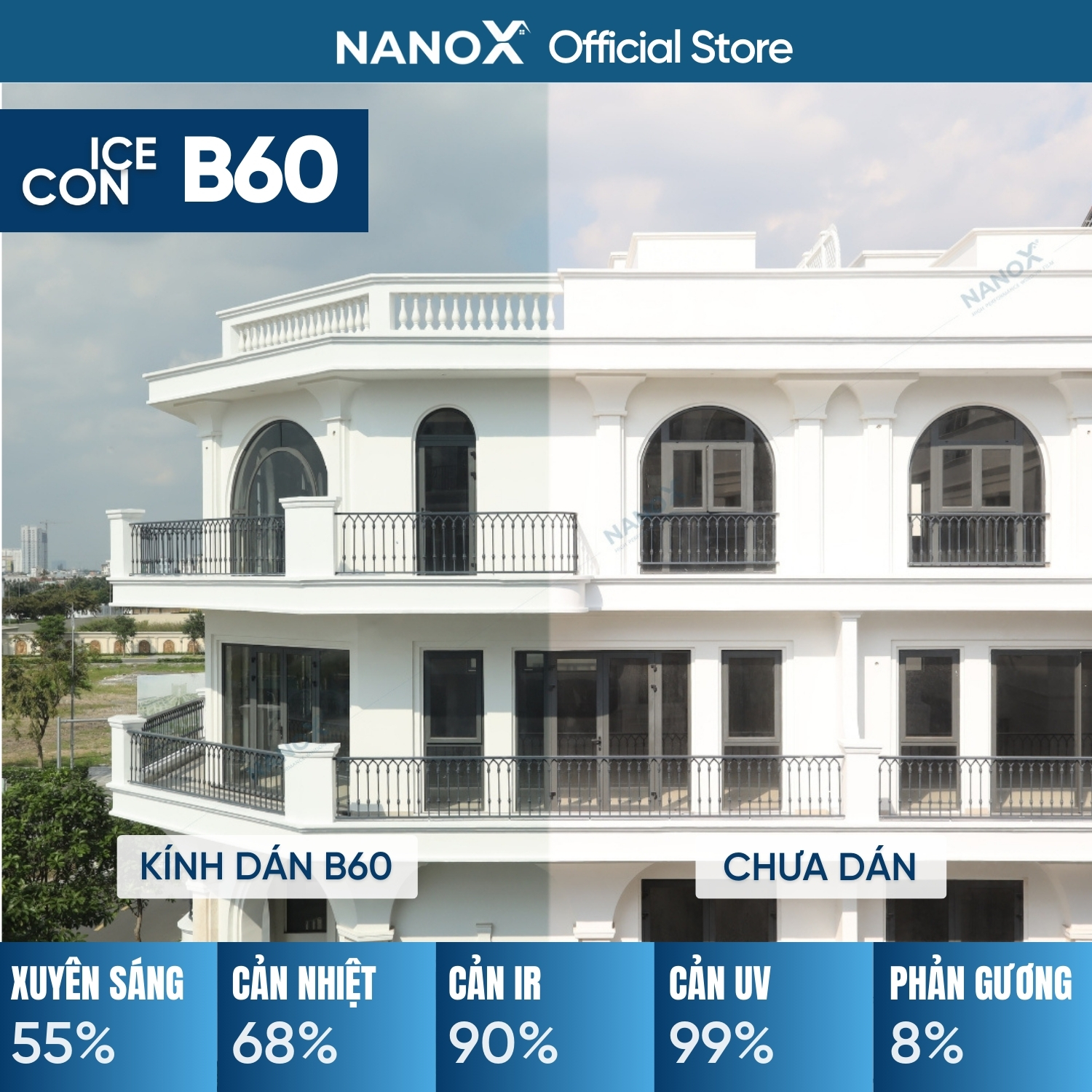 - Lợi ích: Không gian mát dịu, bảo vệ da - mắt & bảo vệ sức khoẻ, tầm nhìn rõ, giảm tải thiết bị làm mát (điều hoà) - tiết kiệm điện, tăng sự riêng tư và an ninh… Thông số kỹ thuật NanoX Ice-con B60: