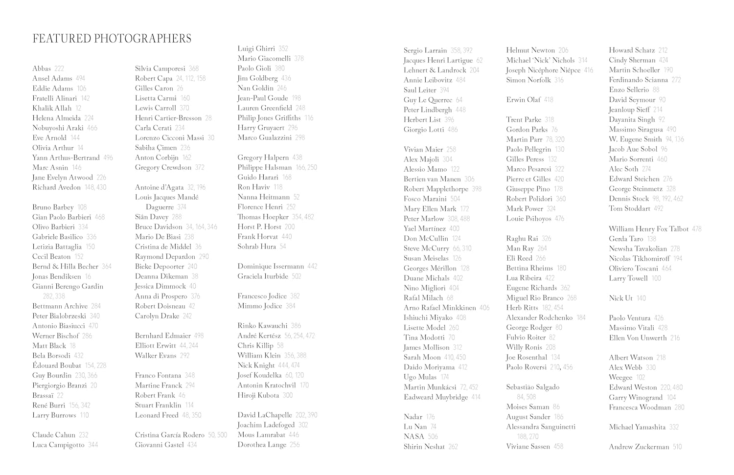 Photographers featured in the collection include Ansel Adams, Richard Avedon, Yann Arthus-Bertrand, Henri Cartier-Bresson, Elliott Erwitt, Robert Frank, Nan Goldin, David LaChapelle, Annie Leibovitz, and Helmut Newton, plus new entries from Claude Cahun, Gregory Crewdson, Chris Killip, Shirin Neshat, Cindy Sherman, and Dayanita Singh, among many others. Each image is accompanied by an engaging commentary and a brief biography of the photographer.