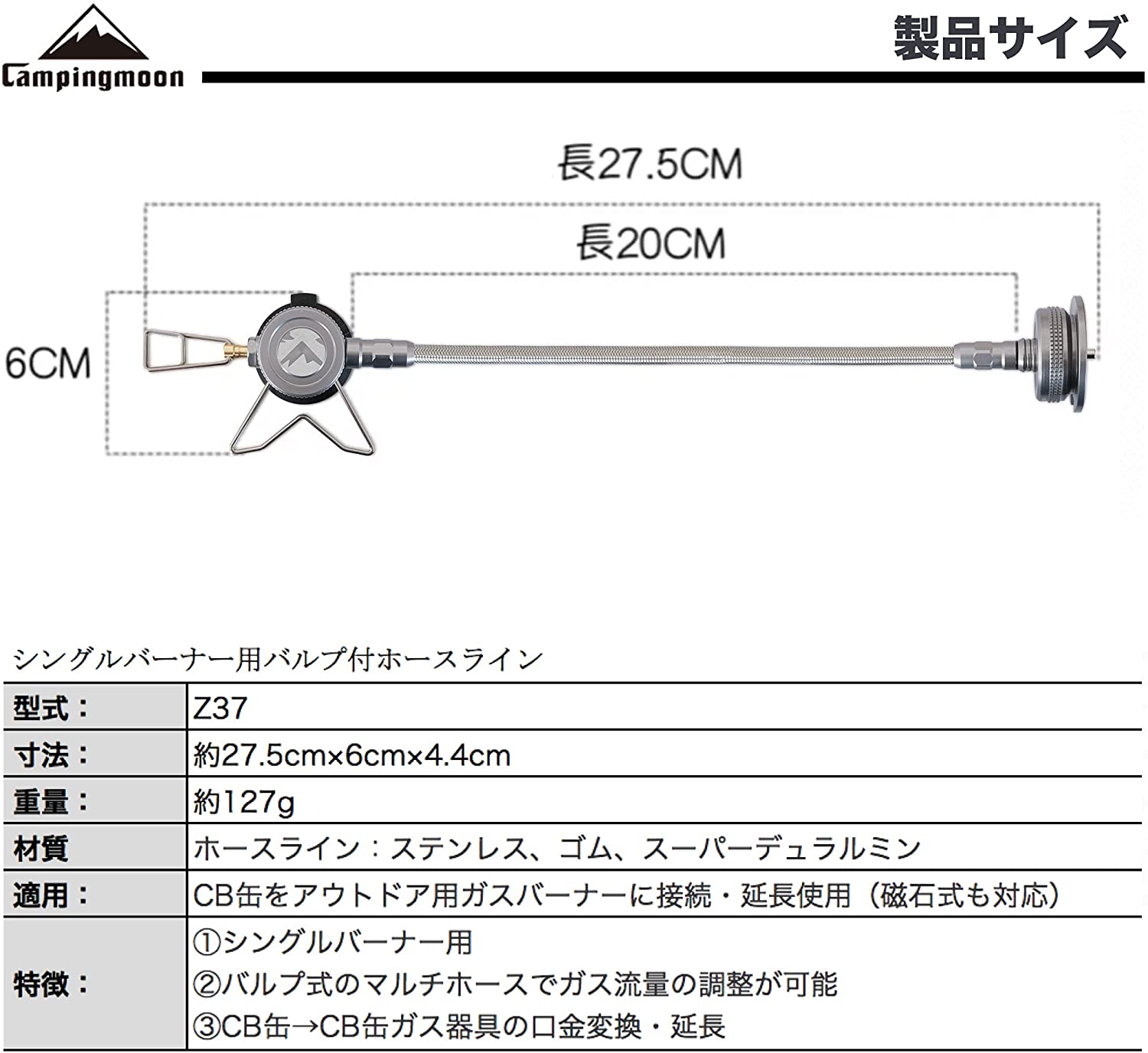 Phụ kiện dây nối dài bình gas mini có van Campingmoon Z37 dùng điều chuyển cho bếp Soto ST-310 ST-340 và bếp cassette compact.