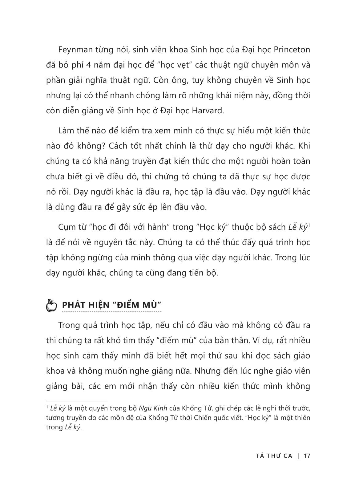 - Thảo luận về các vấn đề cảm xúc, tinh thần trong học tập và thi cử, đưa ra giải pháp kịp thời ngăn chặn tình trạng giảm sút và tâm trí lơ là, tăng khả năng hành động tiến tới hiệu quả học tăng cao. Một cách tư duy mới với Phương pháp học FEYNMAN, bạn sẽ biết thế nào là “học một biết mười” và kết quả thi tiến bộ nhanh như tên lửa! Về tác giả: Tả Thư Ca là một trong mười nhà giáo dục có ảnh hưởng nhất trên Weibo. Xuất thân từ vùng nông thôn, Tả Thư Ca chưa từng tham gia lớp bồi dưỡng hay được cha mẹ kèm cặp mà tự m.ình học tập theo phương pháp Feynman và đỗ Đại học Thanh Hoa (một trong những trường đại học danh giá hàng đầu Trung Quốc) vào năm 1998. Với kinh nghiệm lâu năm trong ngành giáo dục, anh cho rằng: “Điều quyết định thành tích của một học sinh không phải IQ mà là phương pháp học tập.” Bên cạnh việc nghiên cứu giáo dục, anh còn là một blogger, tác giả của hơn 100 đầu sách.
