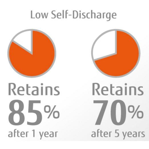 Fujitsu có chỉ số thất thoát năng lượng thấp, giữ lại 85% năng lượng sau 1 năm sản xuất. Là loại pin sạc chất lượng cao, vòng đời sạc lên tới 500 lần, sử dụng bền hơn các loại pin thông thường gấp nhiều lần.