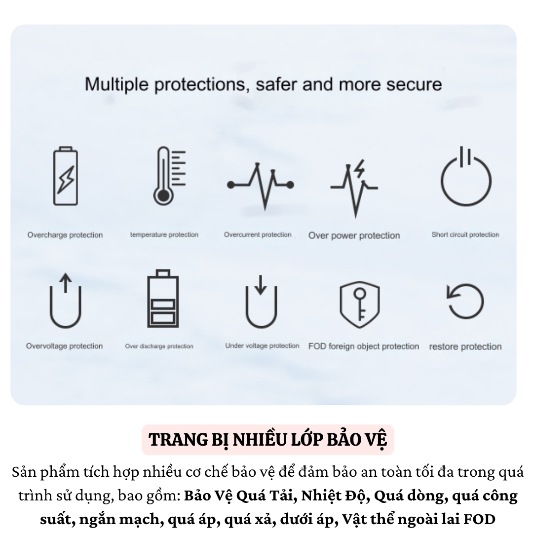 Bảo Vệ Toàn Diện: Công nghệ kiểm soát nhiệt độ NTC với 20 lần phát hiện nhiệt độ mỗi giây giúp duy trì nhiệt độ an toàn khi sạc, tránh tình trạng nóng quá mức. Sản phẩm còn tích hợp nhiều chế độ bảo vệ như: chống quá tải, bảo vệ quá nhiệt, chống ngắn mạch, chống quá áp, và bảo vệ thiết bị khỏi các vật thể lạ.