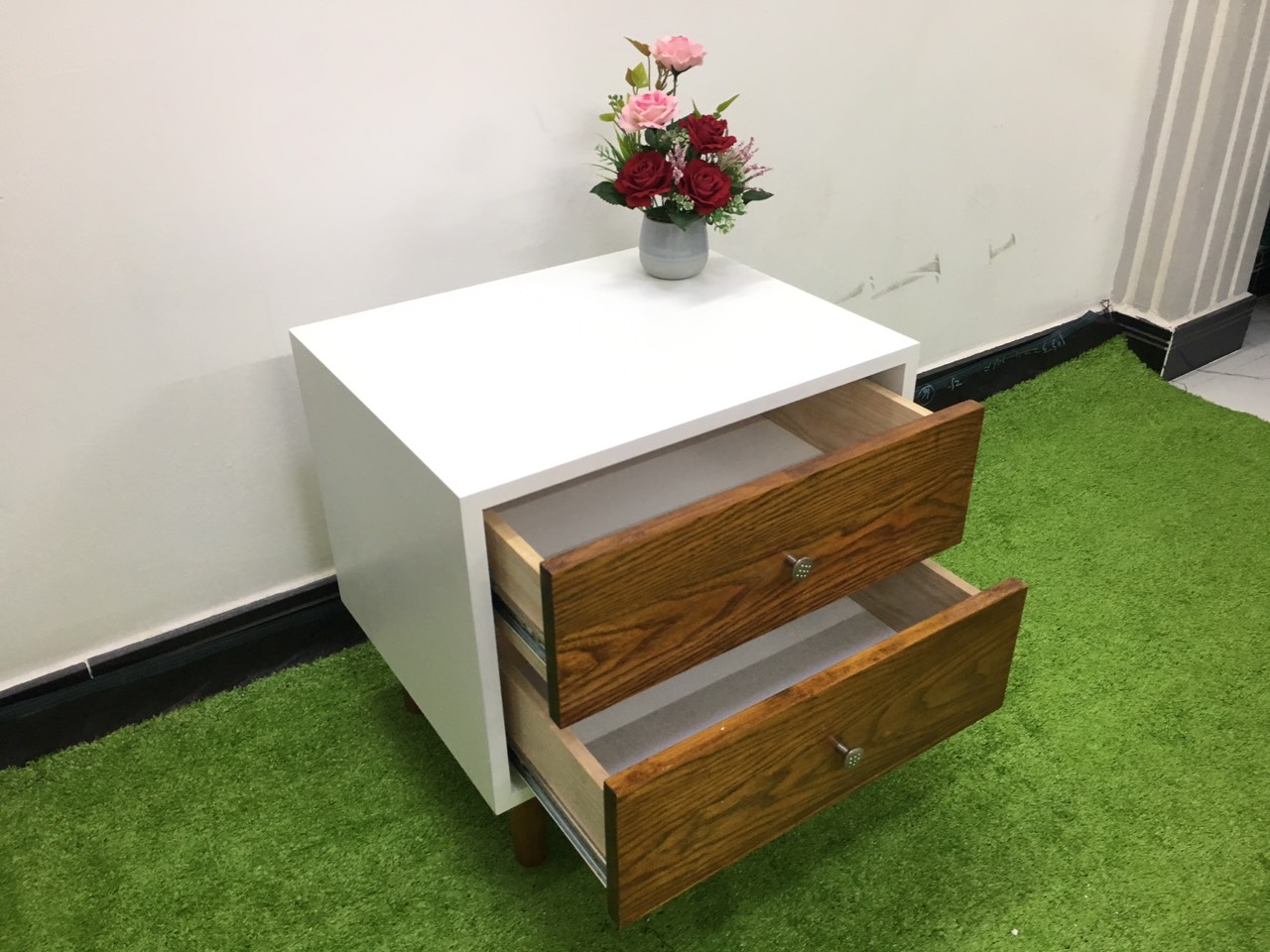 THÔNG TIN SẢN PHẨM - Tên sản phẩm: Tab đầu giường phong cách Nordic - Chất liệu: Gỗ MDF phủ melamin, chân gỗ sồi tự nhiên - Màu sắc: Trắng - Vân gỗ - Cấu