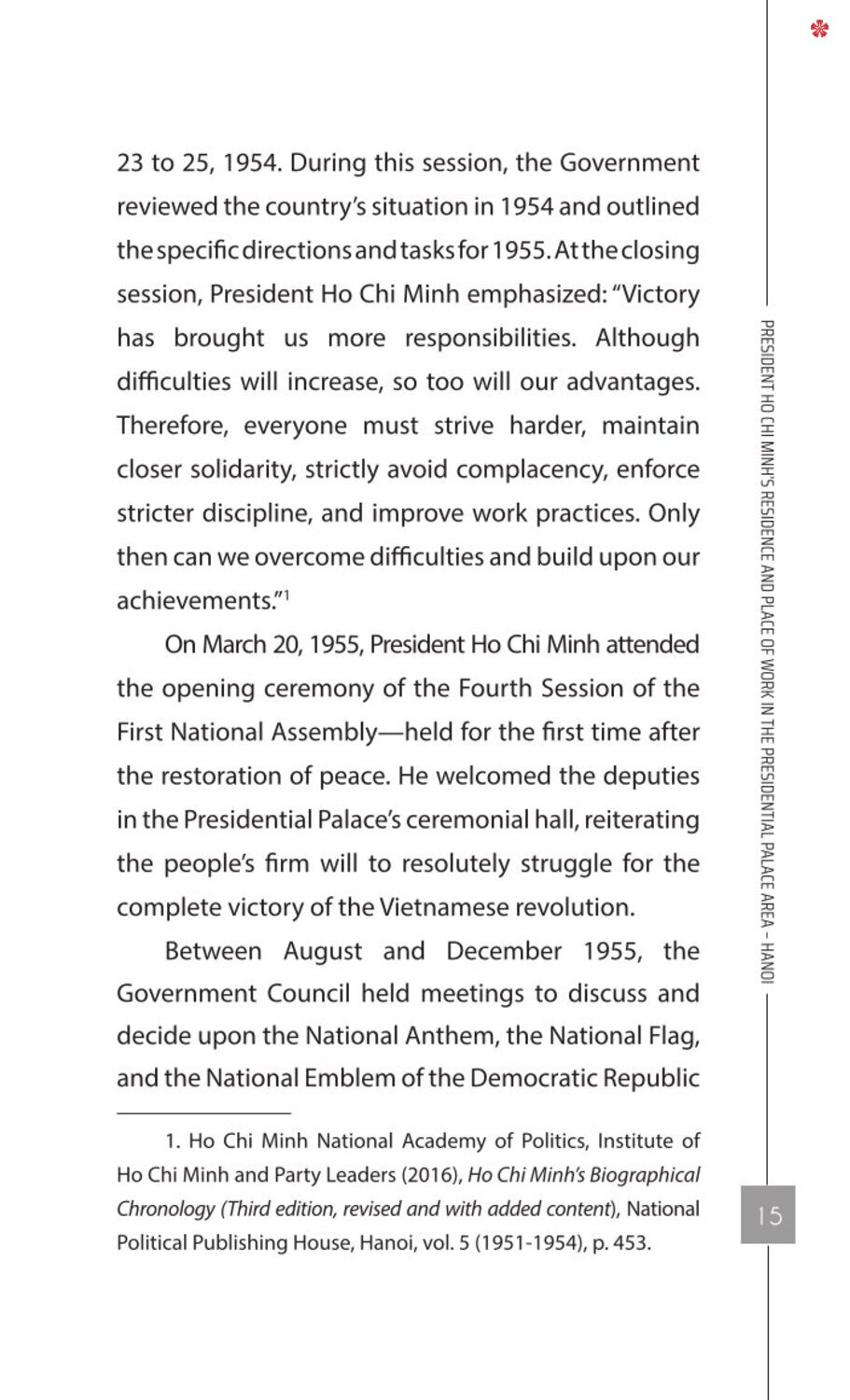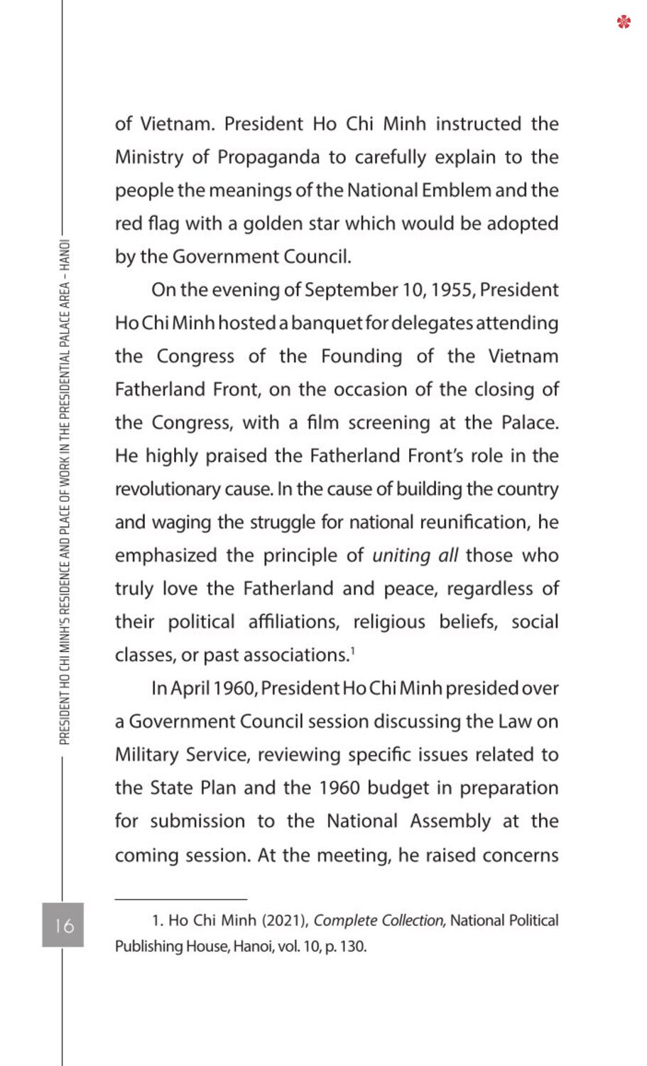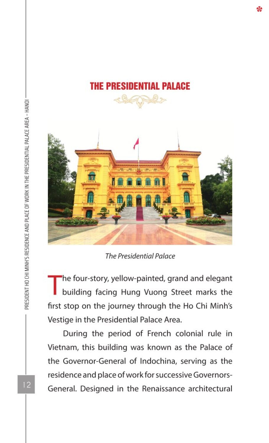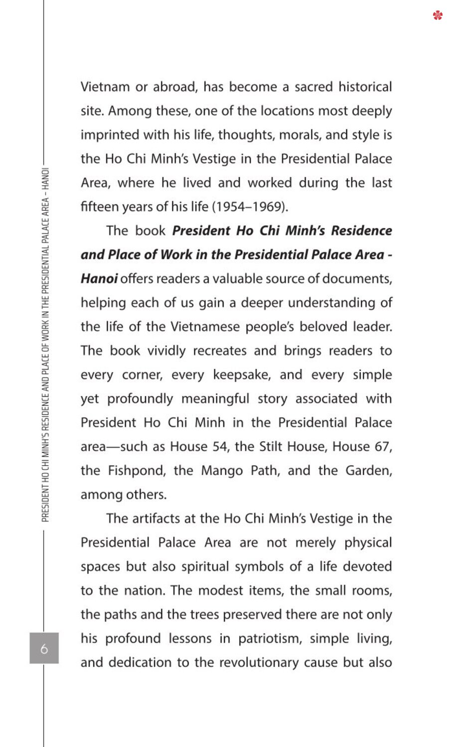 Mua tại TiktokThe book President Ho Chi Minh’s Residence and Place of Work in the Presidential Palace Area - Hanoi offers readers a valuable source of documents, helping each of us gain a deeper understanding of the life of the Vietnamese people’s beloved leader. The book vividly recreates and brings readers to every corner, every keepsake, and every simple yet profoundly meaningful story associated with President Ho Chi Minh in the Presidential Palace area—such as House 54, the Stilt House, House 67, the Fishpond, the Mango Path, and the Garden, among others.