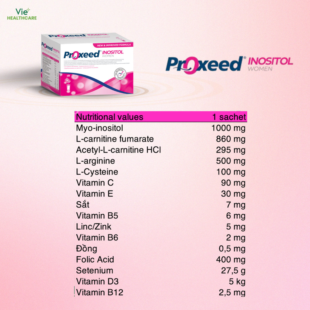 Myo-Inositol 1000 mg, L-carnitin fumarat 860 mg (tương đương 500 mg L-Carnitin), Acetyl-L-Carnitin HCl 250 mg (tương đương 168 mg L-Carnitin), L-arginin 500 mg, L-Cystein 100 mg, Vitamin C (L-ascorbic acid) 90 mg, Vitamin E (dạng DL-alpha-tocopherylacetate) 30 mg, Sắt (dạng sắt gluconat) 7 mg, vitamin B5 (dạng calci D-pantothenat) 6 mg, Kẽm (dạng kẽm lactat) 5 mg, vitamin B6 (dạng Pyridoxin Hydrochlorid) 2 mg, Đồng (dạng đồng sulfat) 0,5 mg, Acid Folic (vitamin B9, dạng muối calci của Methyltetrahydrofolat) 400 mcg, Selen (từ nấm men giàu selen) 27,5 mcg, Vitamin D3 (dạng Cholecalciferol) 5 mcg, Vitamin B12 (Cyanocobalamin) 2,5 mcg.