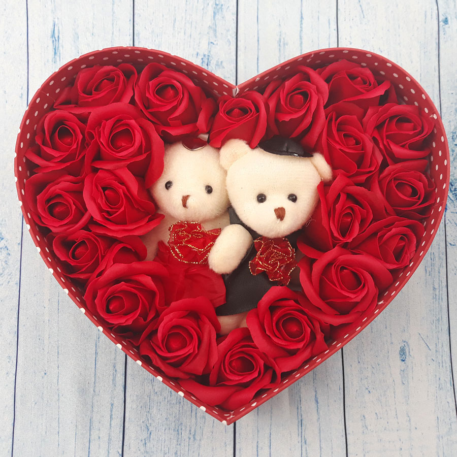 Hoa hồng sáp hộp tim 2 gấu (20 bông), hộp cao - H15 (4 màu)