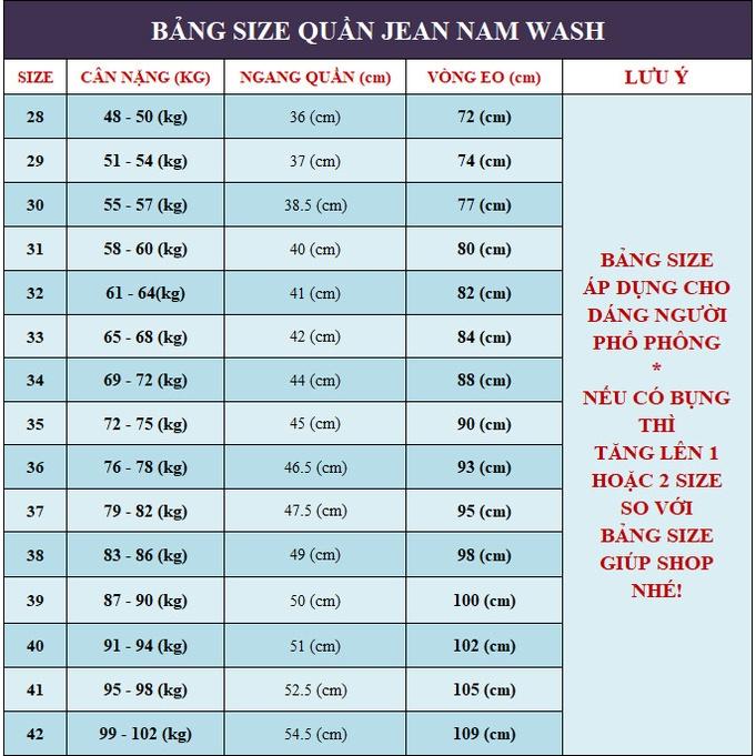 Quần Jean Nam TH Store Bò Kaki Siêu Co Dãn Nhiều Màu Xanh và Đen Hướng dẫn chọn size quần jean nam TH Store: Size 29 cho nam cân nặng từ: 50 - 60 kg