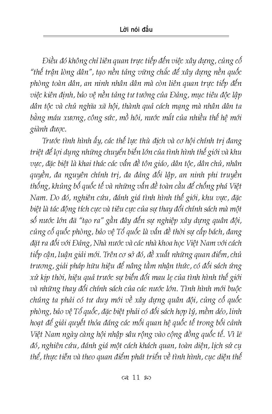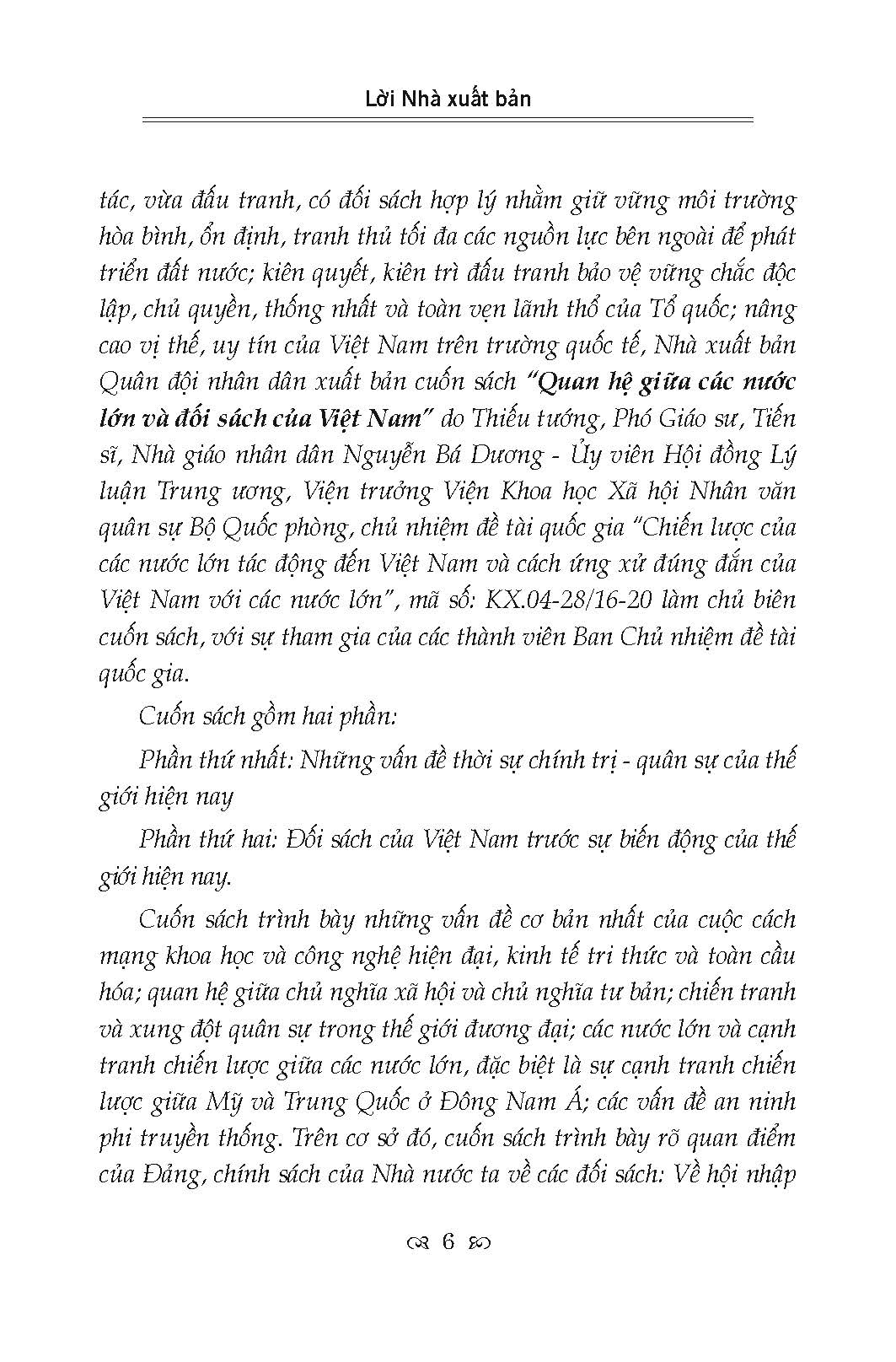 Cuốn sách trình bày những vấn đề cơ bản nhất của cuộc cách mạng khoa học và công nghệ hiện đại, kinh tế tri thức và toàn cầu hóa; quan hệ giữa chủ nghĩa xã hội và chủ nghĩa tư bản; chiến tranh và xung đột quân sự trong thế giới đương đại; các nước lớn và cạnh tranh chiến lược giữa các nước lớn, đặc biệt là sự cạnh tranh chiến lược giữa Mỹ và Trung Quốc ở Đông Nam Á; các vấn đề an ninh phi truyền thống. Trên cơ sở đó, cuốn sách trình bày rõ quan điểm của Đảng, chính sách của Nhà nước ta về các đối sách: Về hội nhập uốc tế, xây dựng thực lực mạnh; kế sách giữ nước; bảo vệ Tổ quốc xã hội chủ nghĩa; kết hợp xây dựng và bảo vệ Tổ quốc…
