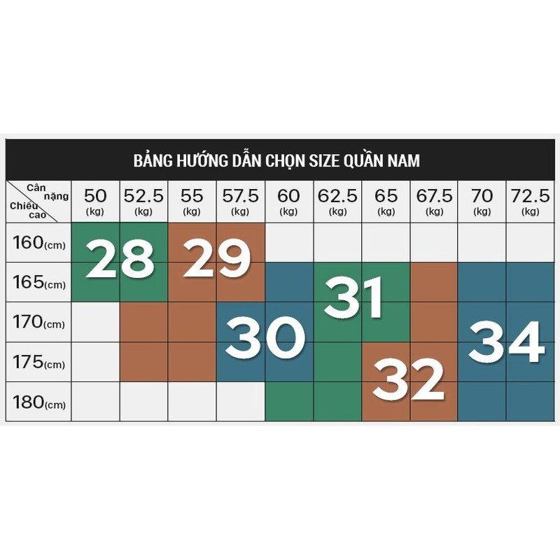 CÁCH CHỌN SIZESize 28 (Từ 50 - 55kg Cao Dưới 1m70)Size 29 (Từ 55 - 68kg Cao Dưới 1m70)Size 30 (Từ 58 - 61kg Cao Dưới 1m70)Size 31 ( Từ 61- 63kg Cao Dưới 1m70)Size