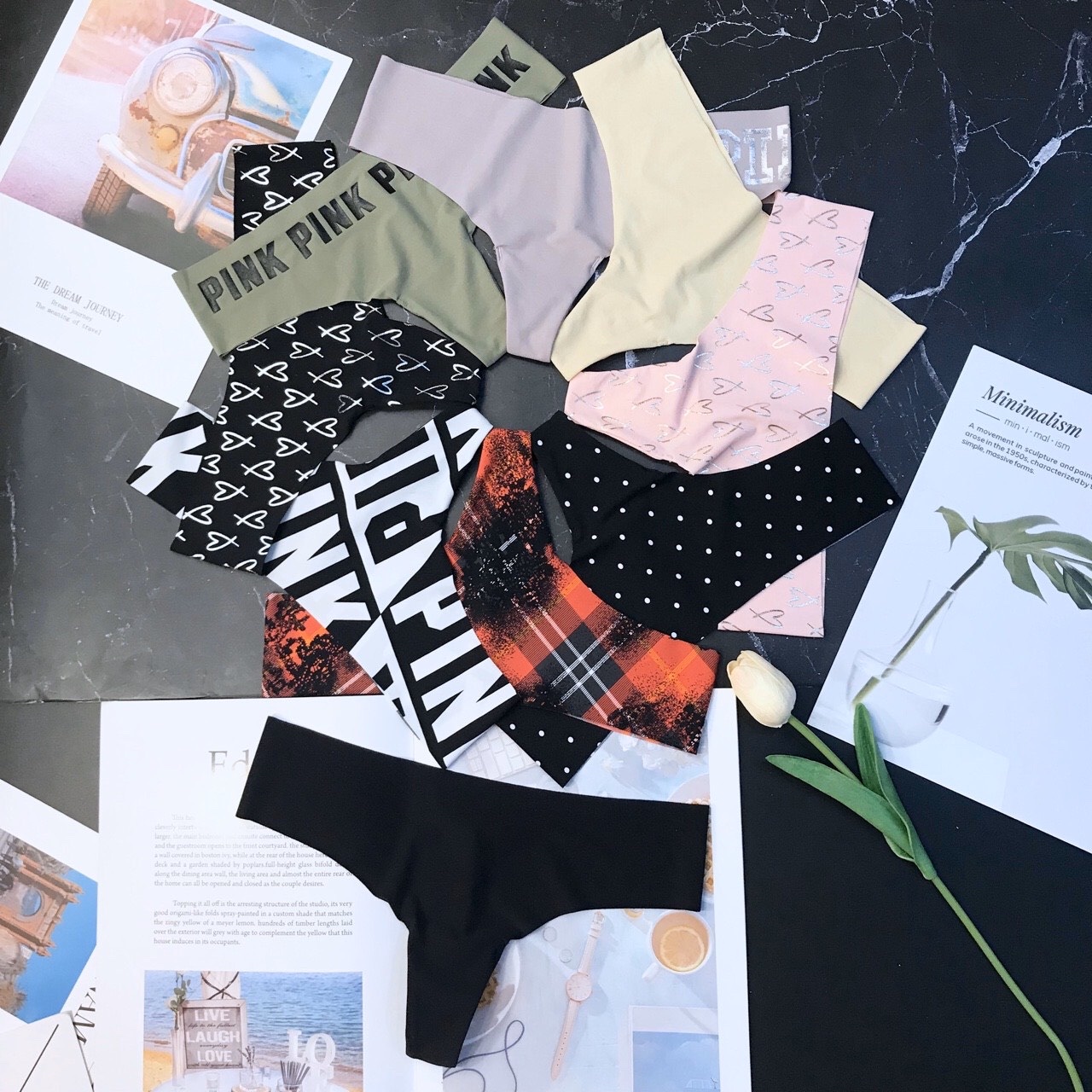 Họa tiết trẻ trung: Từ trái tim ngọt ngào, chấm bi cổ điển đến dòng chữ “PINK” cá tính, dễ dàng phối với nội y và trang phục ngoài.