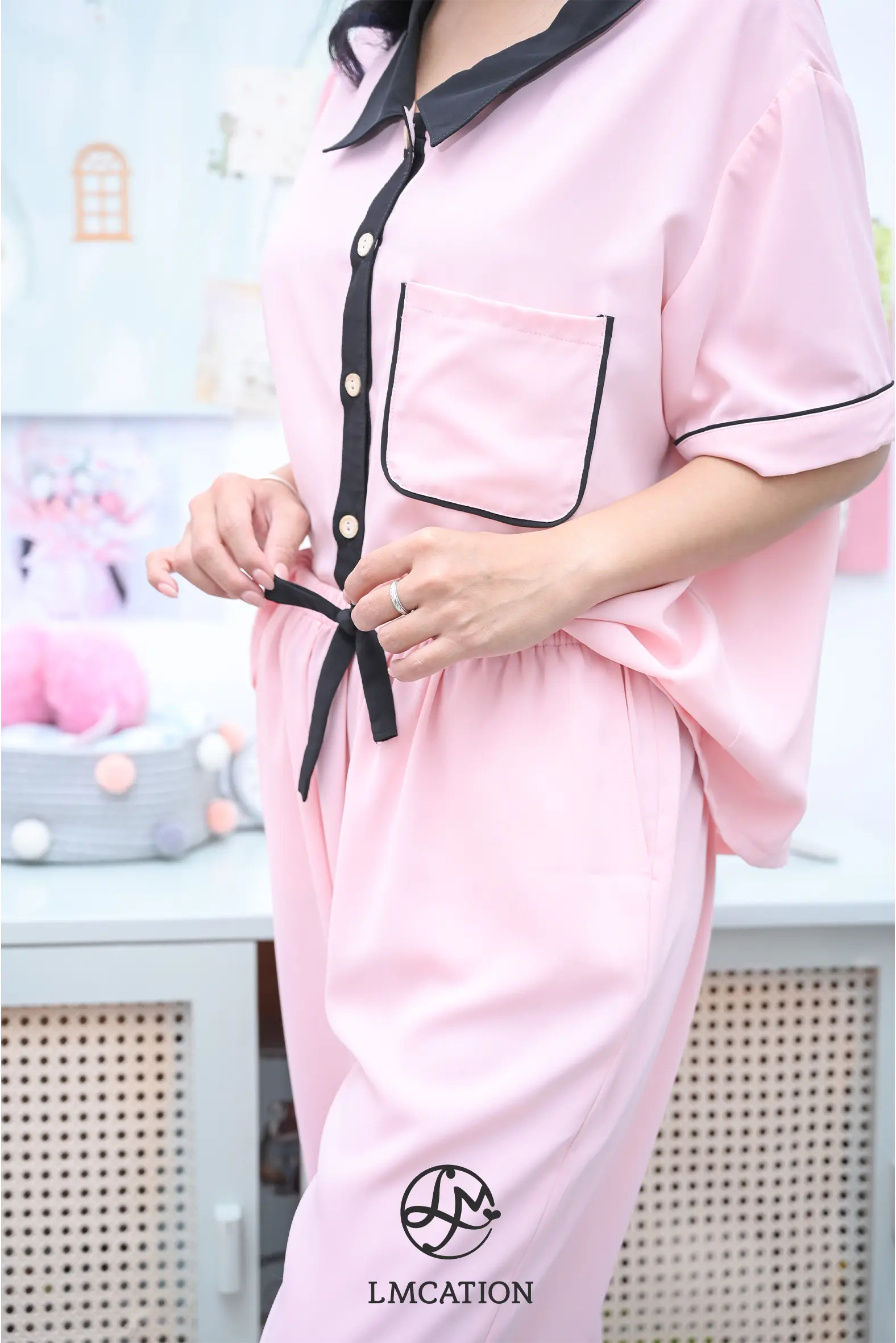 Quần lửng mặc nhà LMcation Alia mềm mại, sang trọng, được may từ chất liệu lụa cao cấp. Quần dài qua đầu gối, có túi hai bên tiện lợi và đính nơ xinh xắn, hoàn