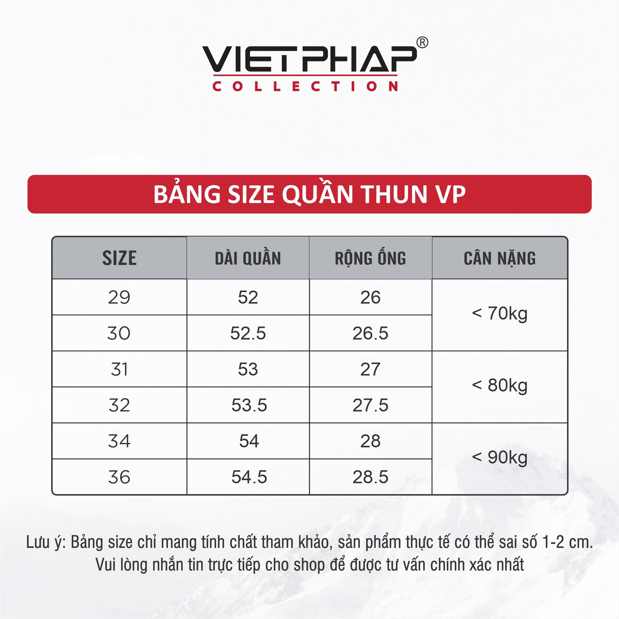 LƯU Ý: - Bảng size chỉ mang tính chất tham khảo, tùy thuộc vào số đo cơ thể mỗi người và chất liệu vải khác nhau sẽ có sự chênh lệch nhất định từ 1 - 2cm.