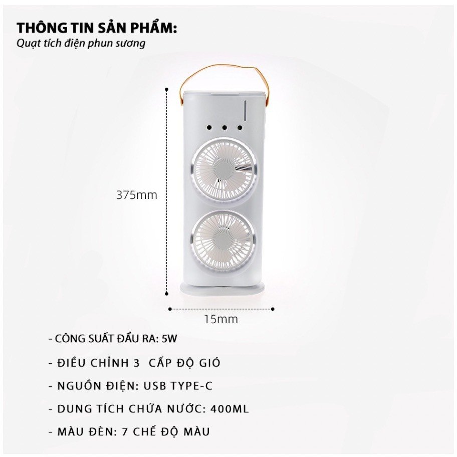 QUẠT HƠI NƯỚC QUẠT PHUN SƯƠNG MINI Quạt phun sương mini, Quạt Hơi Nước Tích Hợp Đèn LED Với 2 Cánh Gió, 3 Đầu Phun Sương Sử Dụng Cổng Sạc Type C Tiện Dụng