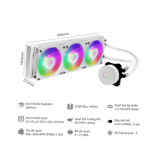 Bộ tản nhiệt & Khối Kích thước: 394 x 119 x 27mm Kích thước bơm: 87,6 x 87,6 x 77,7mm Chất liệu bộ tản nhiệt: Nhôm Chất liệu khối: Đồng Ổ cắm CPU Intel 115x,1200,1700