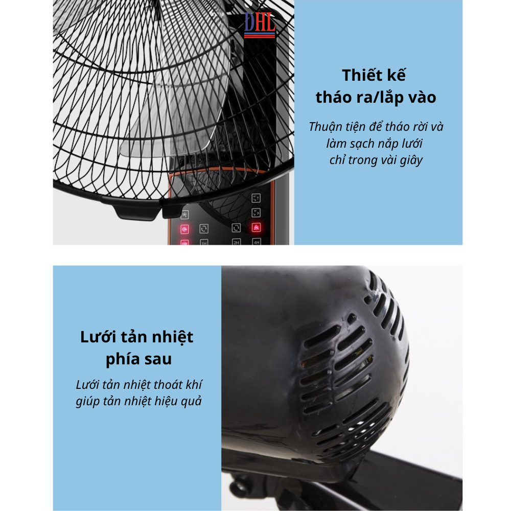 + Lồng quạt có khe hở nang quạt nhỏ, ngón tay người không thể chạm vào cánh quạt. + Người sử dụng không chạm được vào bộ phận mang điện bên trong quạt + Có cầu chì bảo